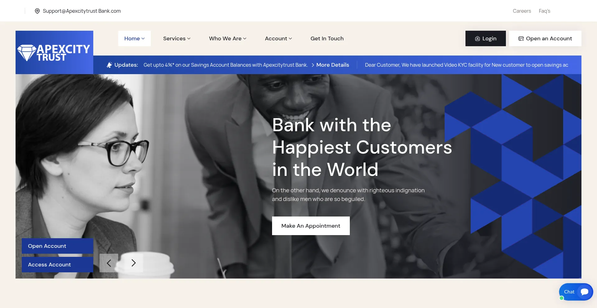 该网站实现数据收集表单,请求个人信息,包括姓名、电子邮件地址、电话号码或其他敏感详细信息。用户应验证 apexcitytrust.com 的合法性并在提交个人数据前查看隐私政策。