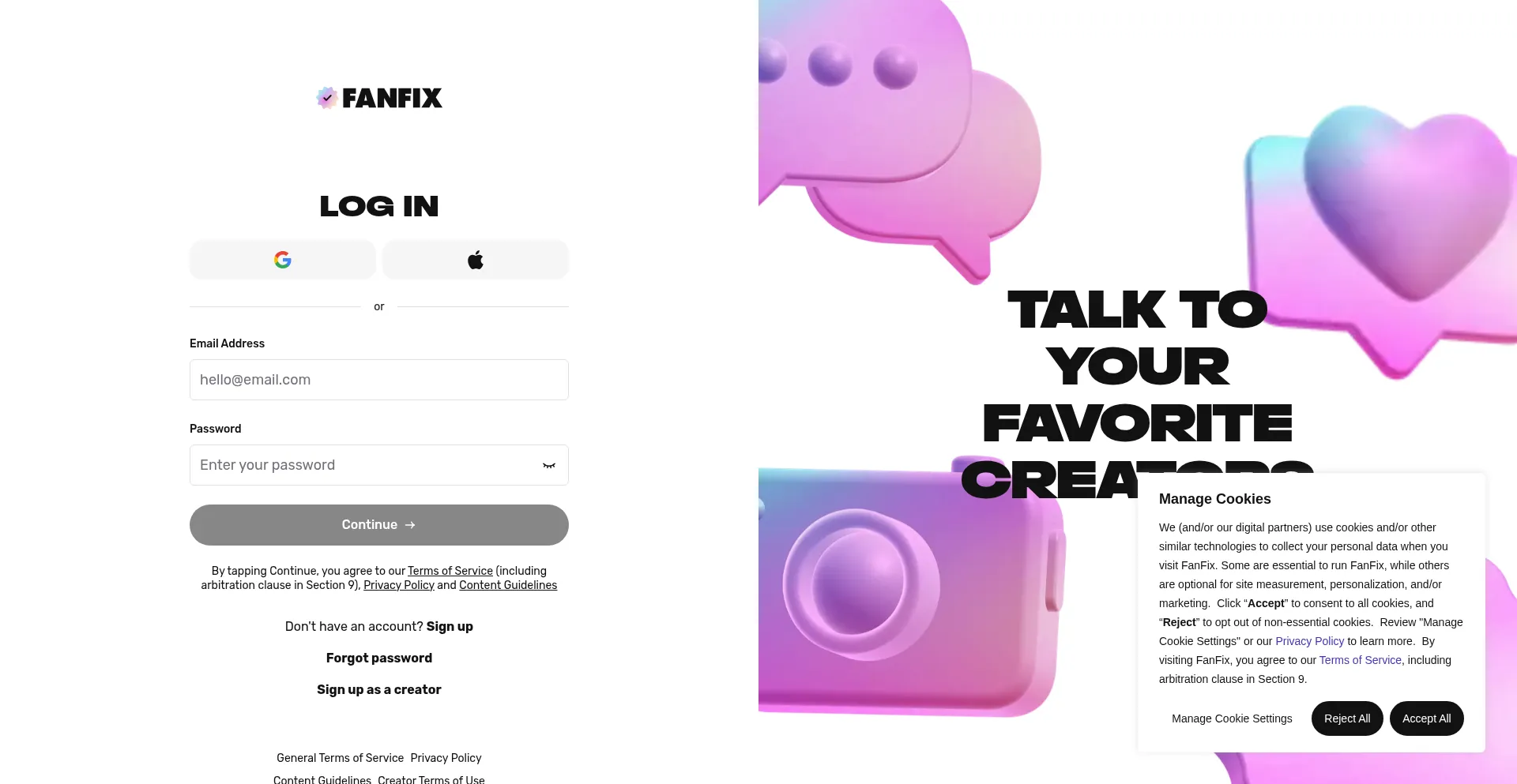 该网站实现符合GDPR或CCPA等隐私法规的cookie同意机制。这表明 app.fanfix.io 遵守数据保护标准并为用户提供对个人数据收集实践的控制。