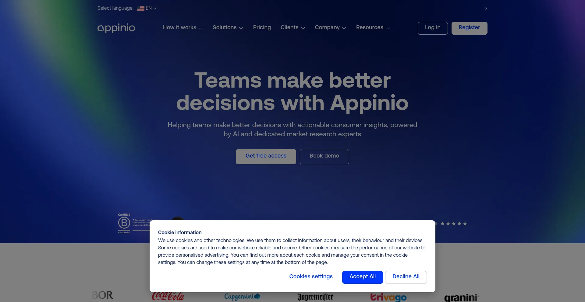 该网站实现符合GDPR或CCPA等隐私法规的cookie同意机制。这表明 appinio.com 遵守数据保护标准并为用户提供对个人数据收集实践的控制。