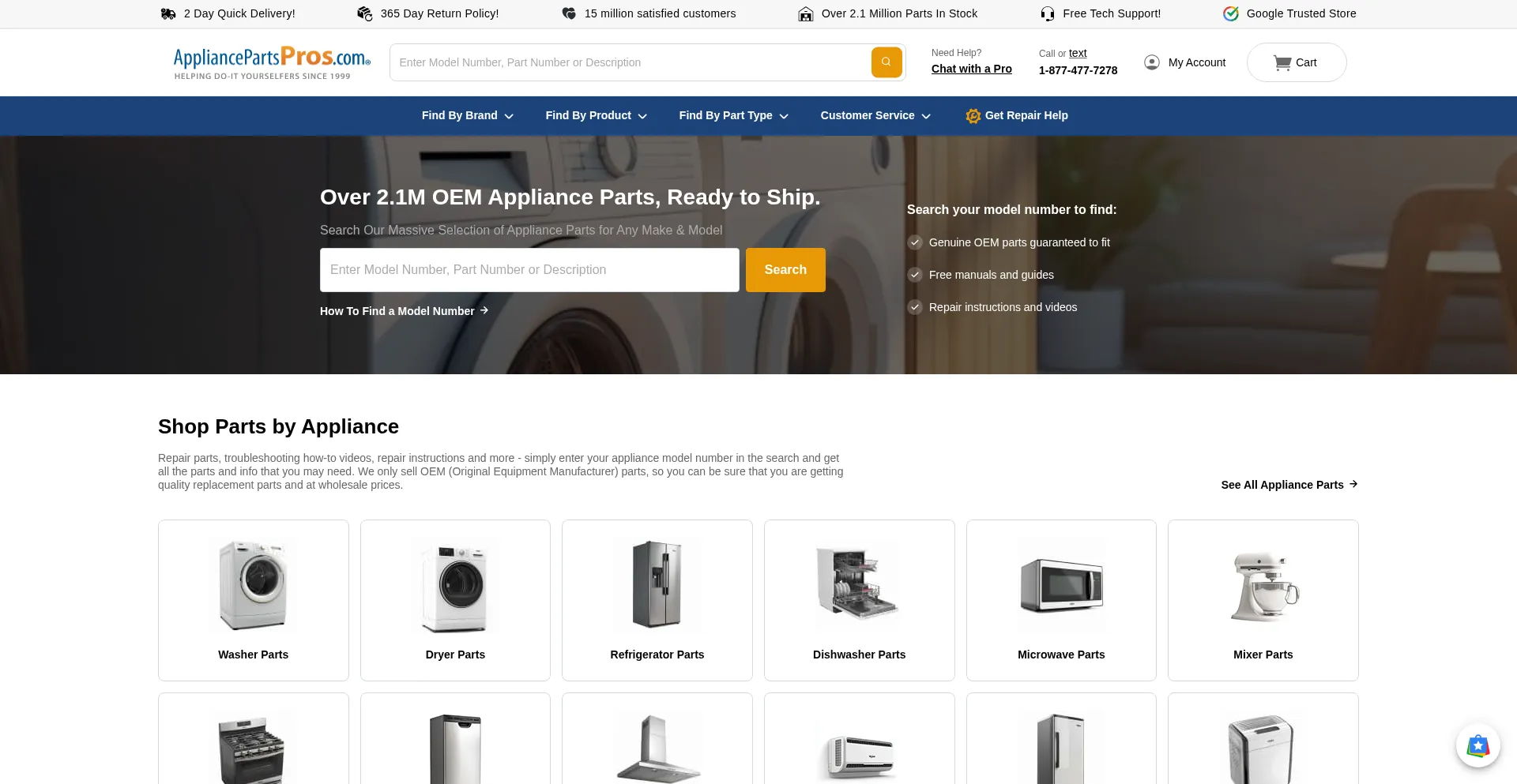 Over 2.1 million appliance parts in stock, ship the same day. Free tech support. 365 days to return any part. Wholesale prices on all appliance parts. Open 9 AM until 8 PM Easte...