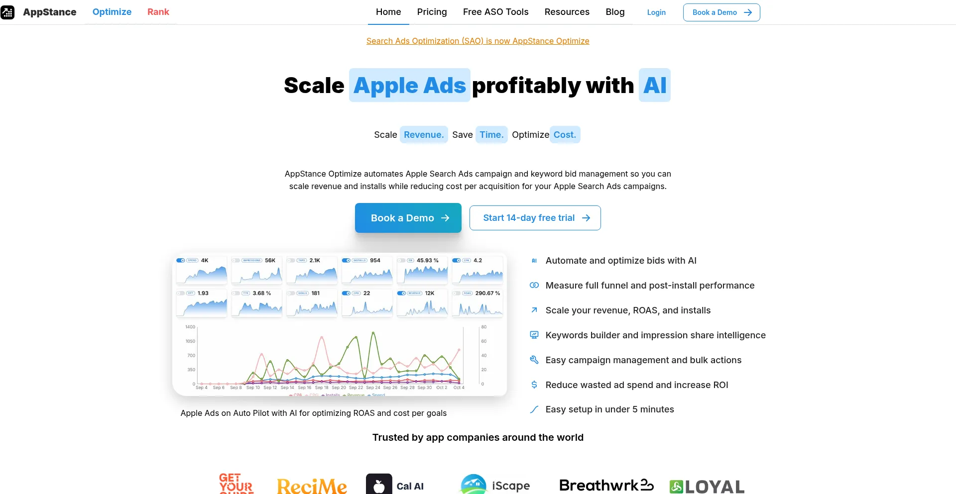 AppStance AI automates Apple Ads campaign and keyword bid management to scale revenue, installs and ROAS.