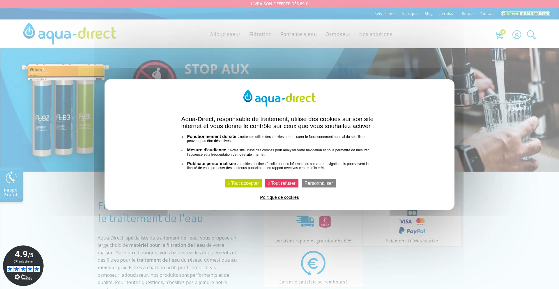 Aqua-Direct est spécialiste du traitement de l'eau domestique. Vente de matériels et d'équipements pour le traitement de l'eau à domicile. Traitement du calcaire, filtration...
