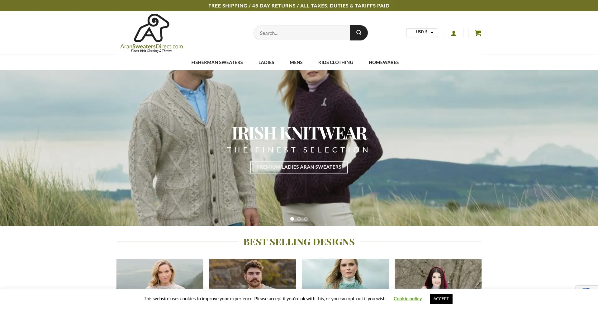 该网站实现符合GDPR或CCPA等隐私法规的cookie同意机制。这表明 aransweatersdirect.com 遵守数据保护标准并为用户提供对个人数据收集实践的控制。