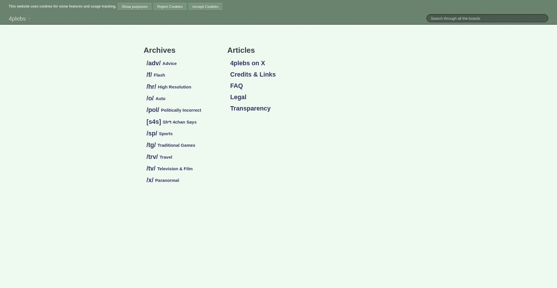 4plebs archives 4chan boards /adv/, /f/, /hr/, /o/, /pol/, [s4s], /sp/, /tg/, /trv/, /tv/ and /x/