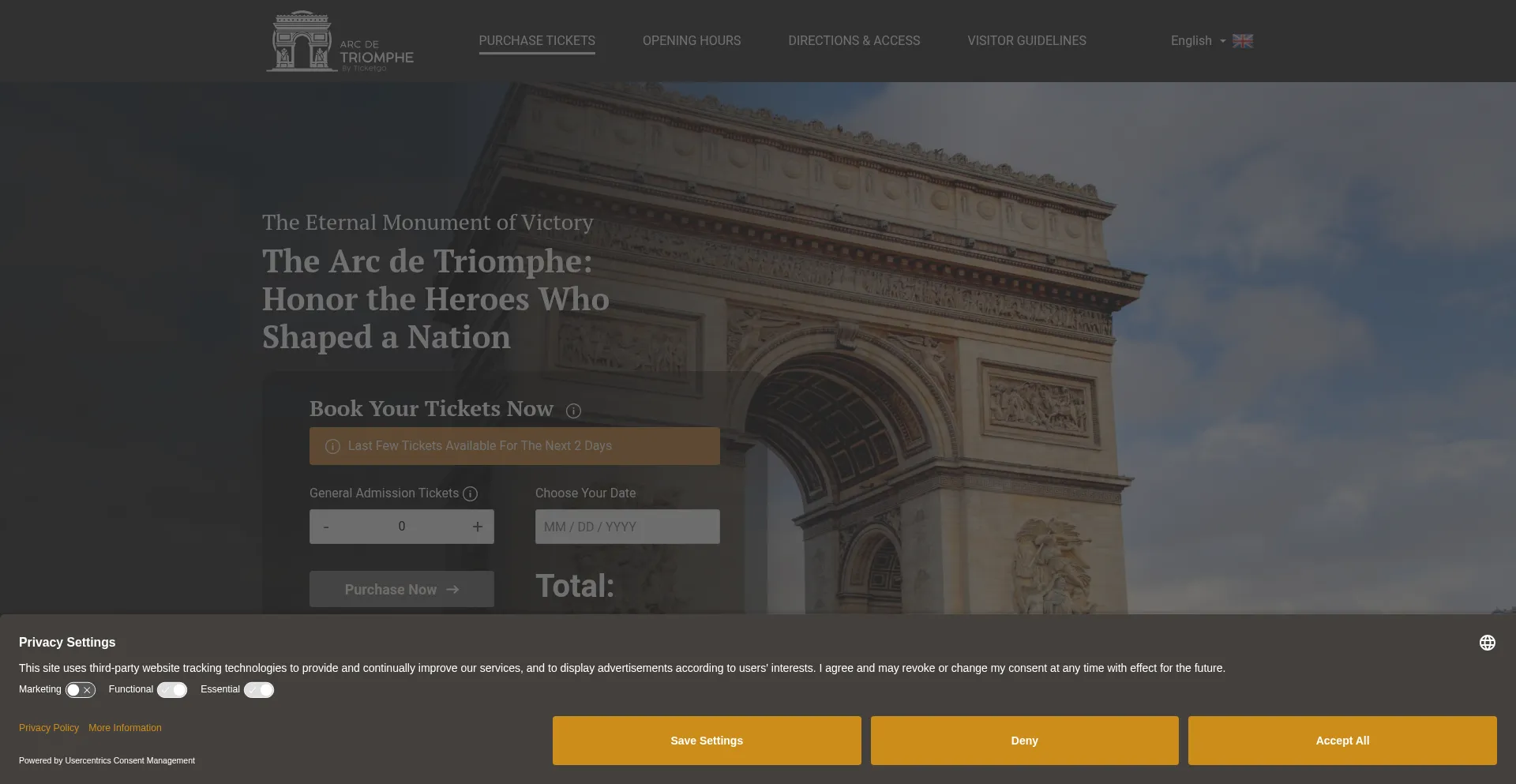 该网站实现符合GDPR或CCPA等隐私法规的cookie同意机制。这表明 arctriompheticket.com 遵守数据保护标准并为用户提供对个人数据收集实践的控制。