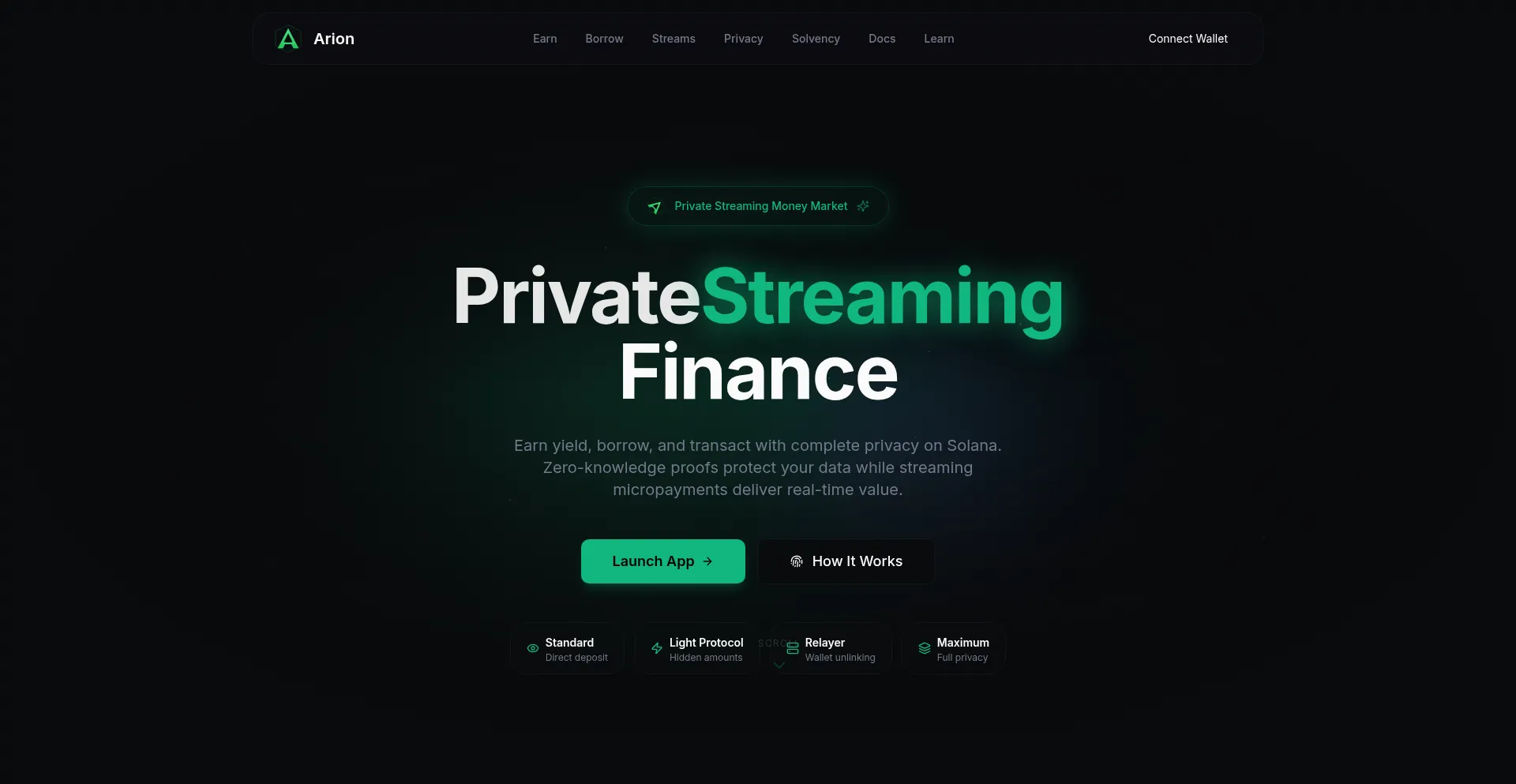 The first private streaming money market on Solana. Earn yield privately with ZK-powered deposits, stealth withdrawals, and real-time streaming payments.