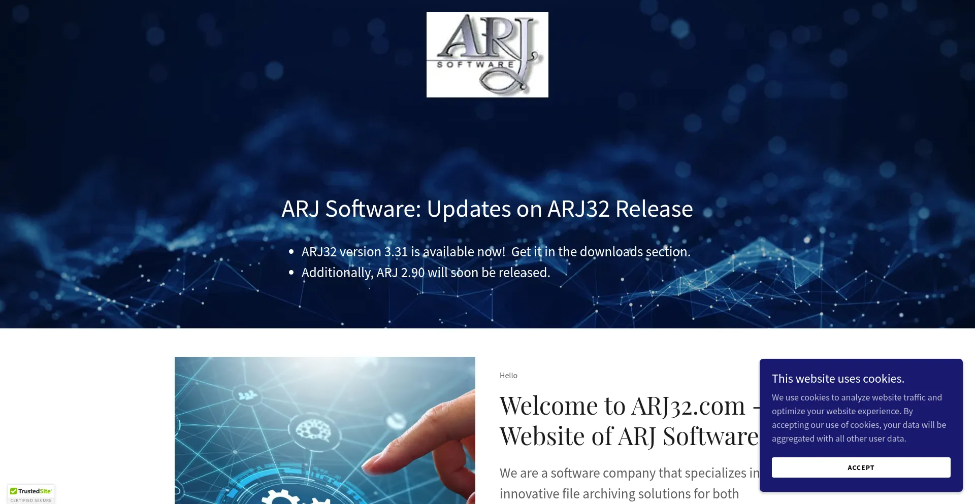 Official site for ARJ Software, offering updates on ARJ32.EXE release and a contact form for inquiries.
