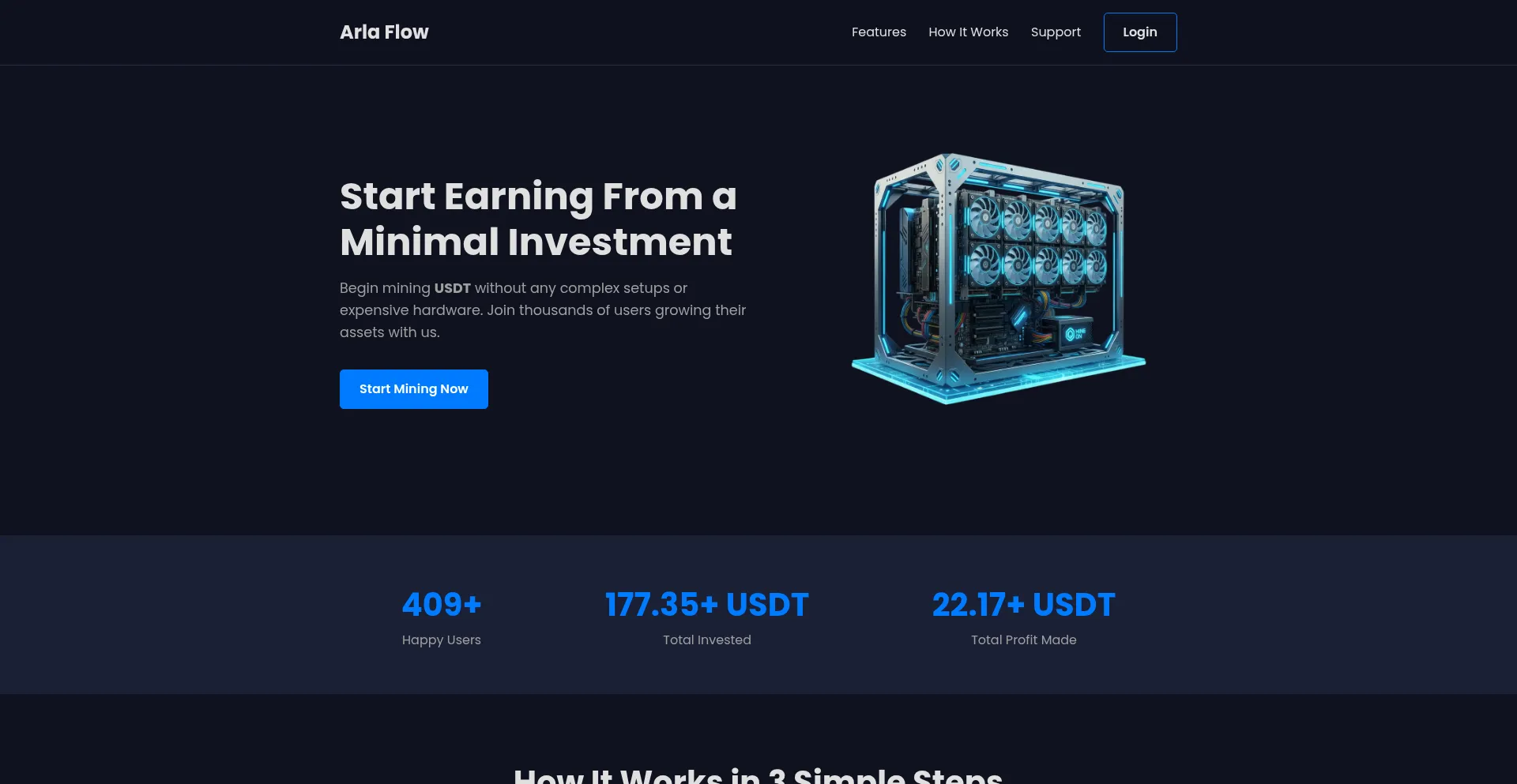 网站 arlaflow.com 可能提供云挖矿服务或加密货币挖矿投资。一些平台提供合法的挖矿租赁服务,而其他平台可能使用虚假的挖矿仪表板来显示无法提取的虚拟收益。