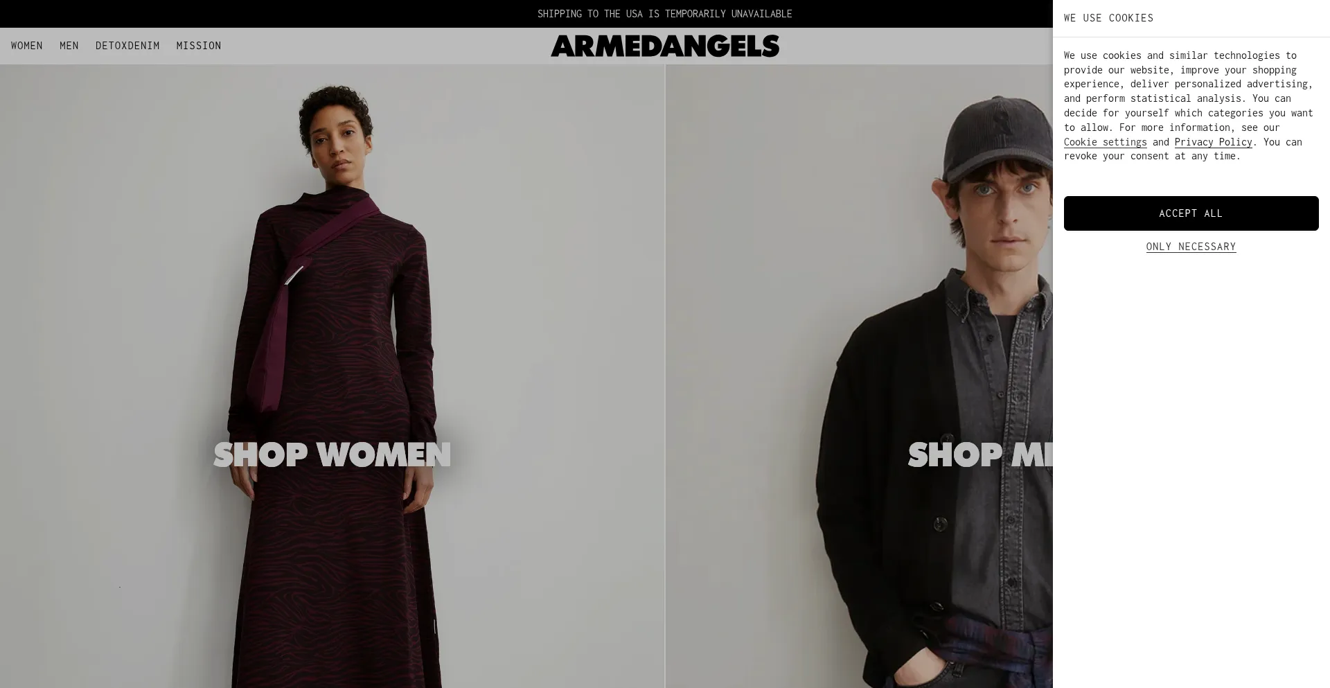 该网站实现符合GDPR或CCPA等隐私法规的cookie同意机制。这表明 armedangels.com 遵守数据保护标准并为用户提供对个人数据收集实践的控制。