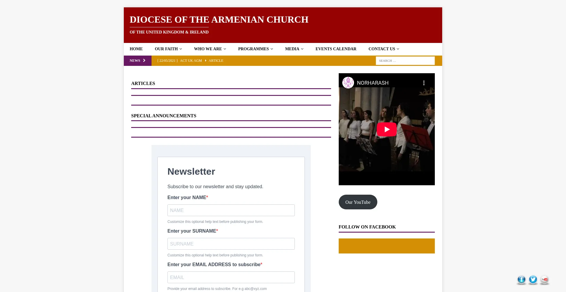 网站上存在社交媒体链接表明 armenianchurch.org.uk 在社交媒体上维护官方账户,这是可信度和参与度的积极信号。