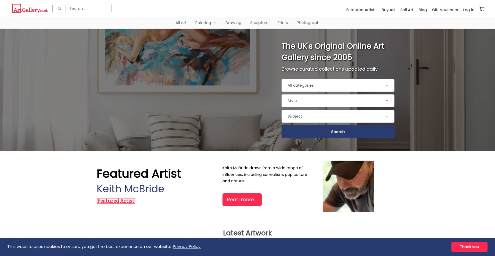 该网站实现符合GDPR或CCPA等隐私法规的cookie同意机制。这表明 artgallery.co.uk 遵守数据保护标准并为用户提供对个人数据收集实践的控制。