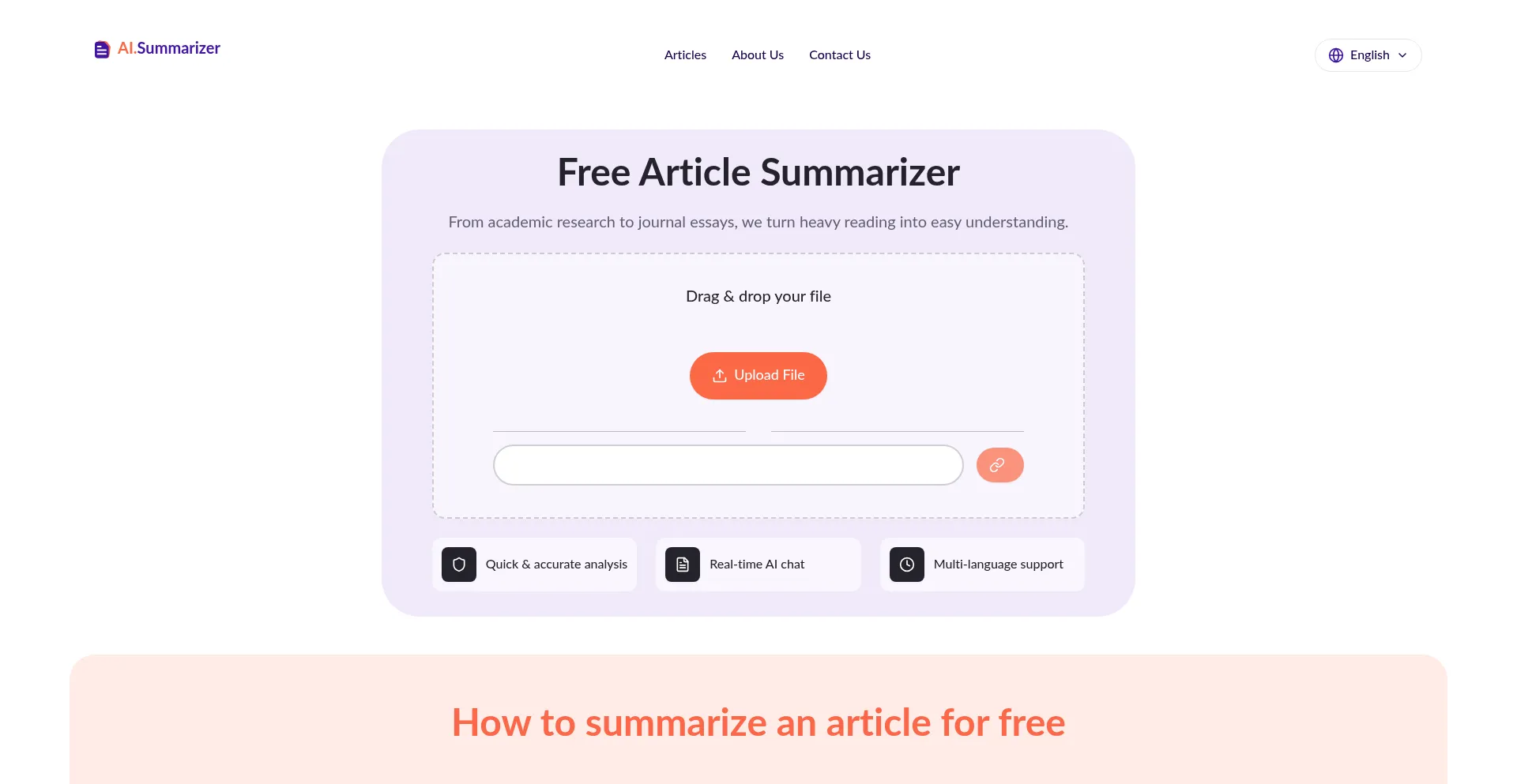 Quickly condense long articles, essays, and research papers with our free AI article summarizer. Extract key points effortlessly using our advanced summarizing tool!