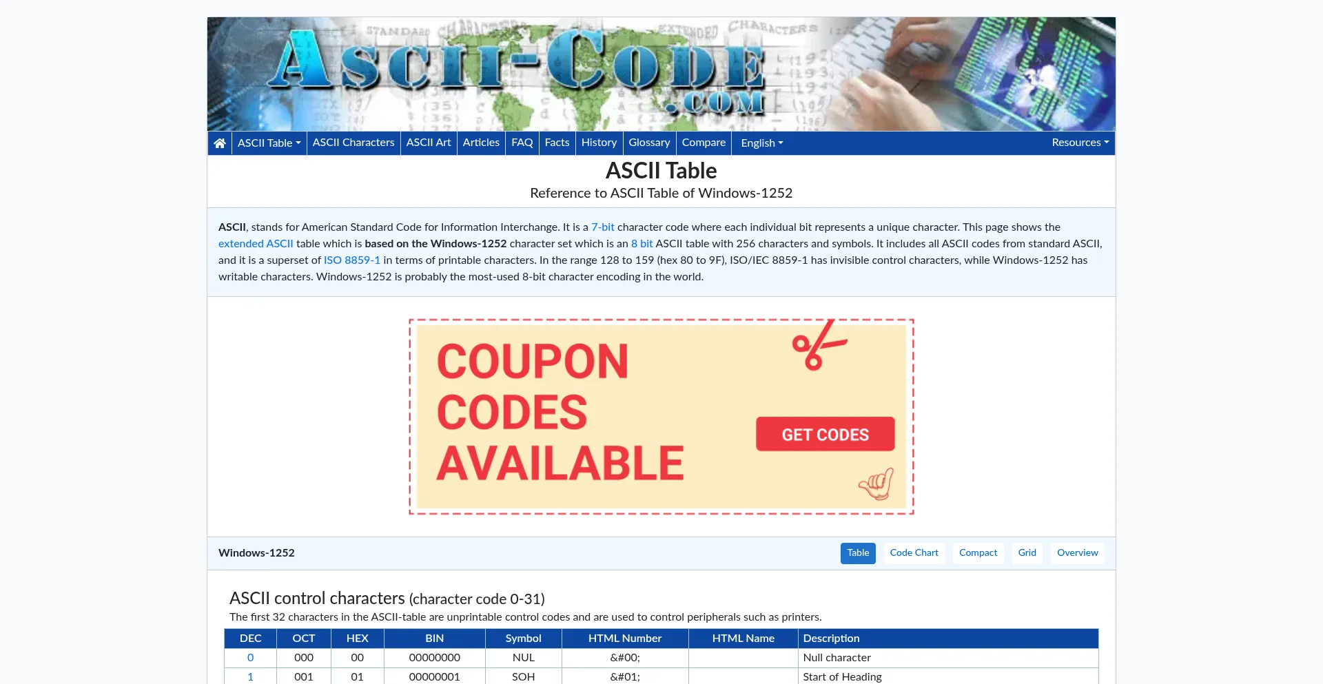 A complete list of all ASCII codes, characters, symbols and signs included in the 7-bit ASCII table and the extended ASCII table according to the Windows-1252 character set, whi...