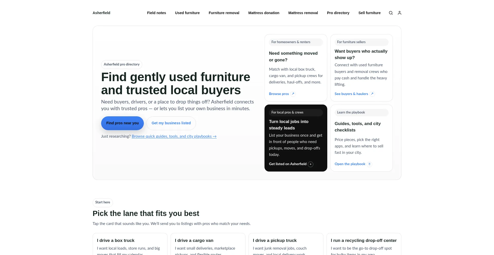 Explore gently used furniture, trusted local buyers, and we-buy crews in one place. Compare options, book pickups, and give good pieces a second life with Asherfield.