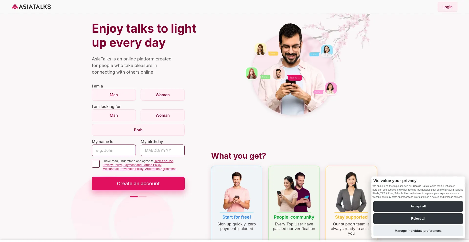 该网站实现数据收集表单,请求个人信息,包括姓名、电子邮件地址、电话号码或其他敏感详细信息。用户应验证 asiatalks.com 的合法性并在提交个人数据前查看隐私政策。