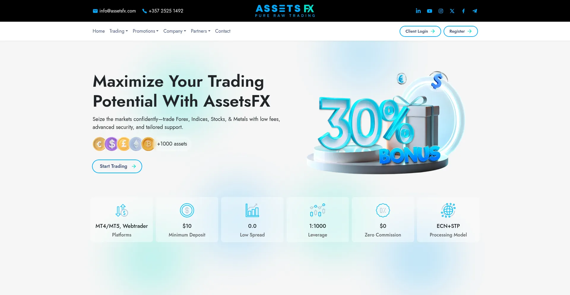 网站上存在社交媒体链接表明 assetsfx.com 在社交媒体上维护官方账户,这是可信度和参与度的积极信号。