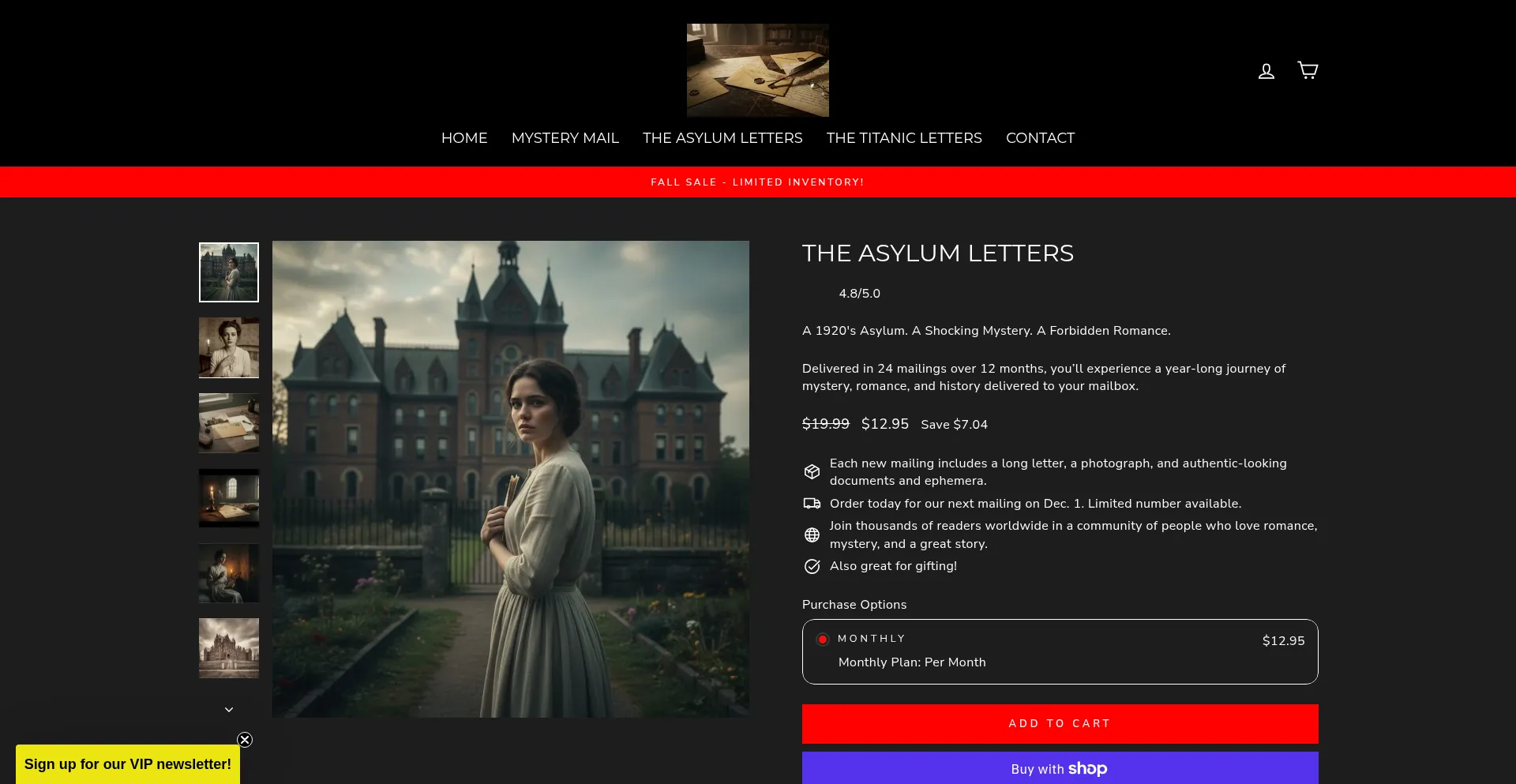 Delivered in 24 mailings, you’ll experience a year-long journey of mystery, romance, and history delivered to your mailbox. A 1920's Asylum. A Forbidden Romance. A Shocking My...