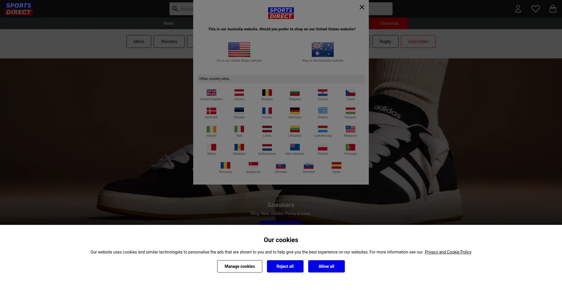 该网站实现符合GDPR或CCPA等隐私法规的cookie同意机制。这表明 au.sportsdirect.com 遵守数据保护标准并为用户提供对个人数据收集实践的控制。