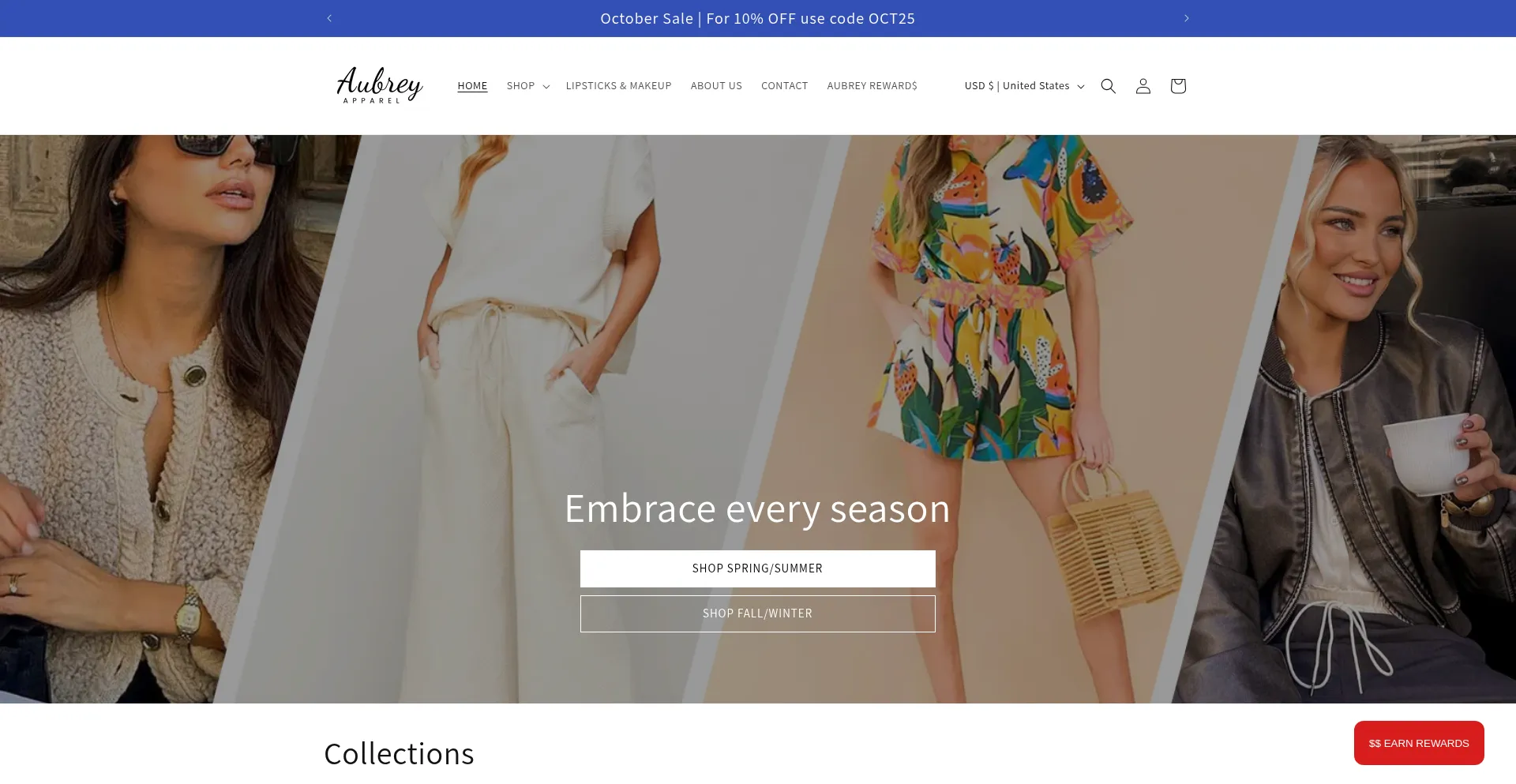 该网站实现数据收集表单,请求个人信息,包括姓名、电子邮件地址、电话号码或其他敏感详细信息。用户应验证 aubreyapparel.com 的合法性并在提交个人数据前查看隐私政策。