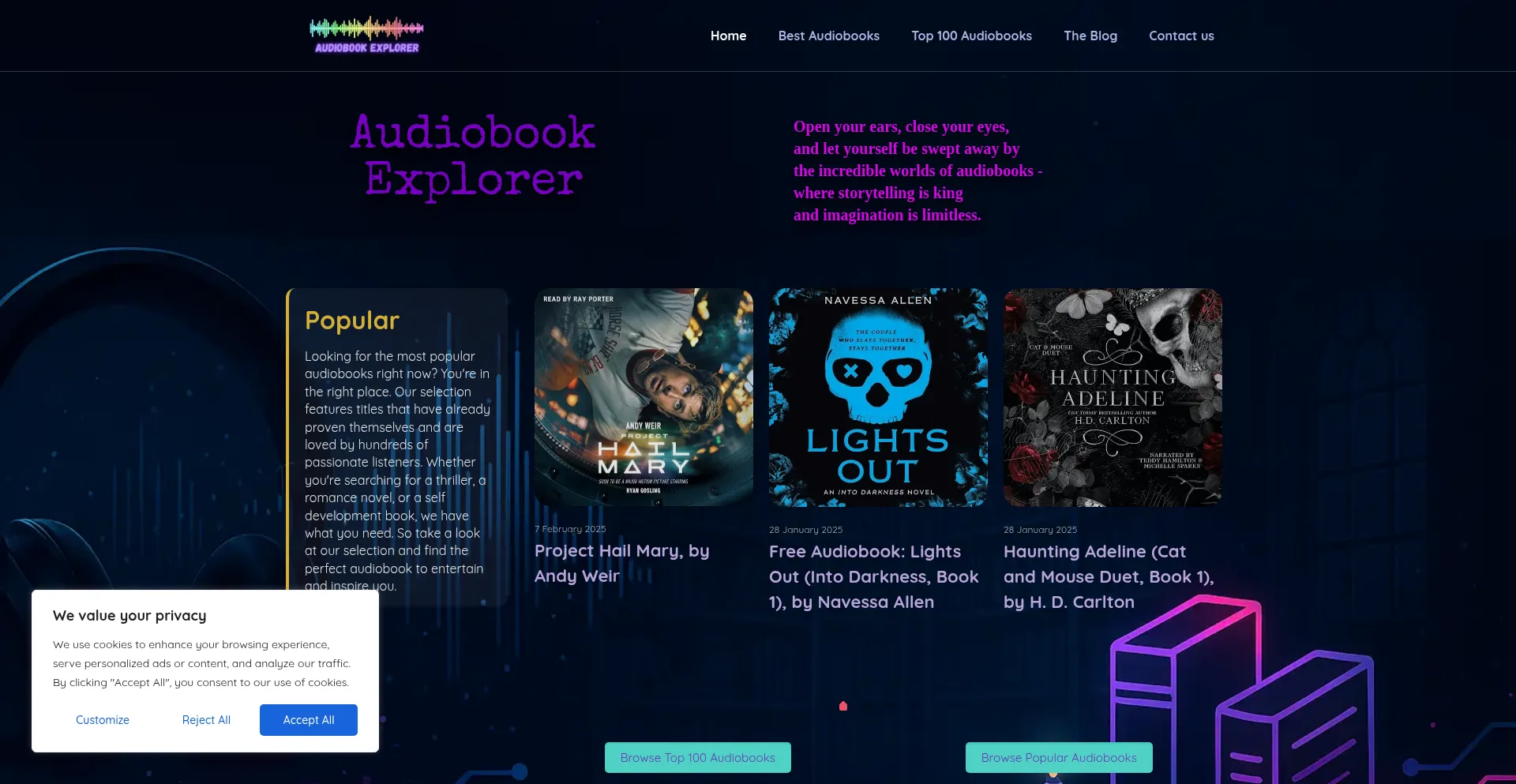 该网站实现符合GDPR或CCPA等隐私法规的cookie同意机制。这表明 audiobookexplorer.com 遵守数据保护标准并为用户提供对个人数据收集实践的控制。