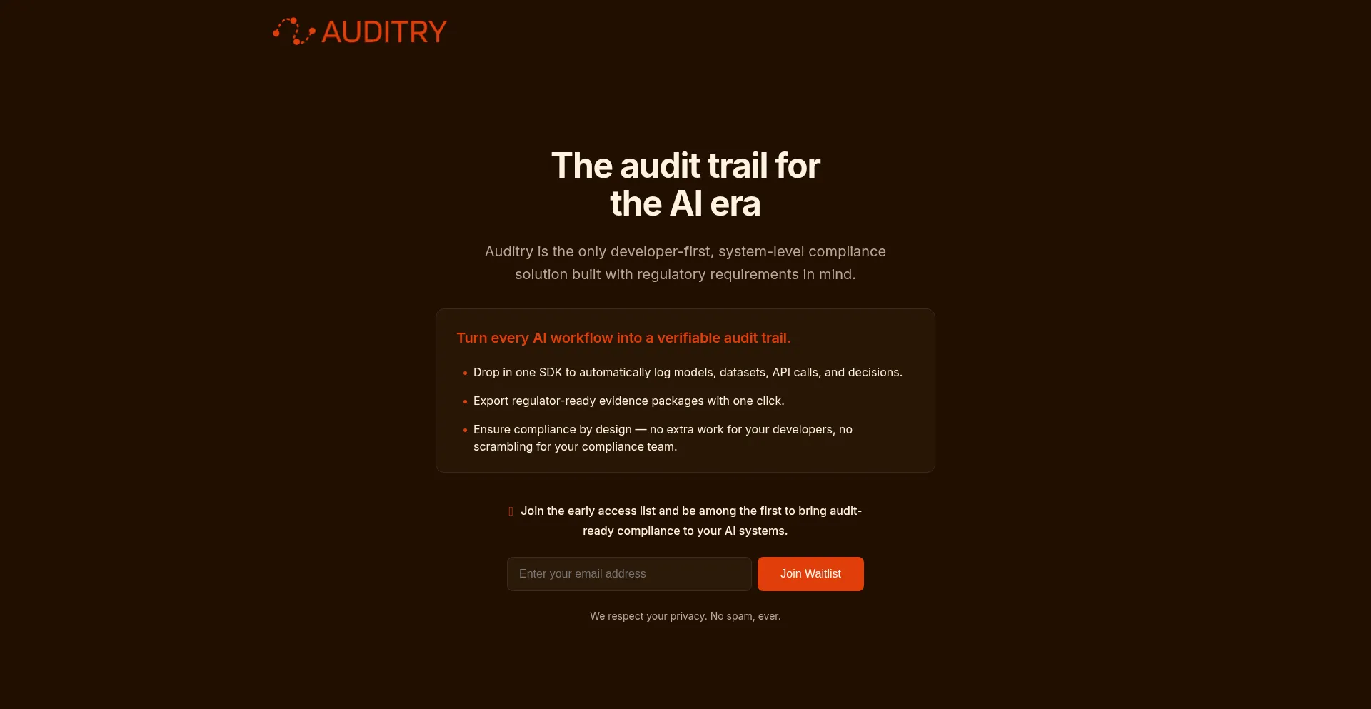 Auditry is the developer-first way to generate automated audit trails and regulator-ready evidence for AI workflows.