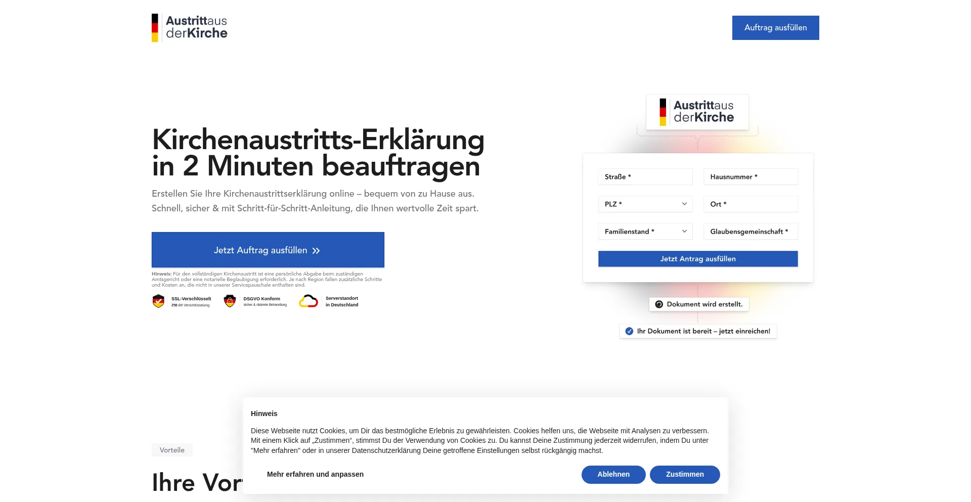 Erstellen Sie Ihre Kirchenaustrittserklärung online – bequem von zu Hause aus. Schnell, sicher & mit Schritt-für-Schritt-Anleitung, die Ihnen wertvolle