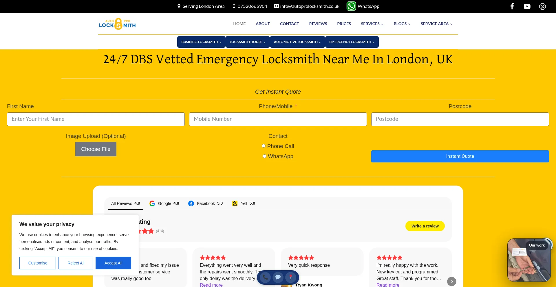 该网站实现数据收集表单,请求个人信息,包括姓名、电子邮件地址、电话号码或其他敏感详细信息。用户应验证 autoprolocksmith.co.uk 的合法性并在提交个人数据前查看隐私政策。
