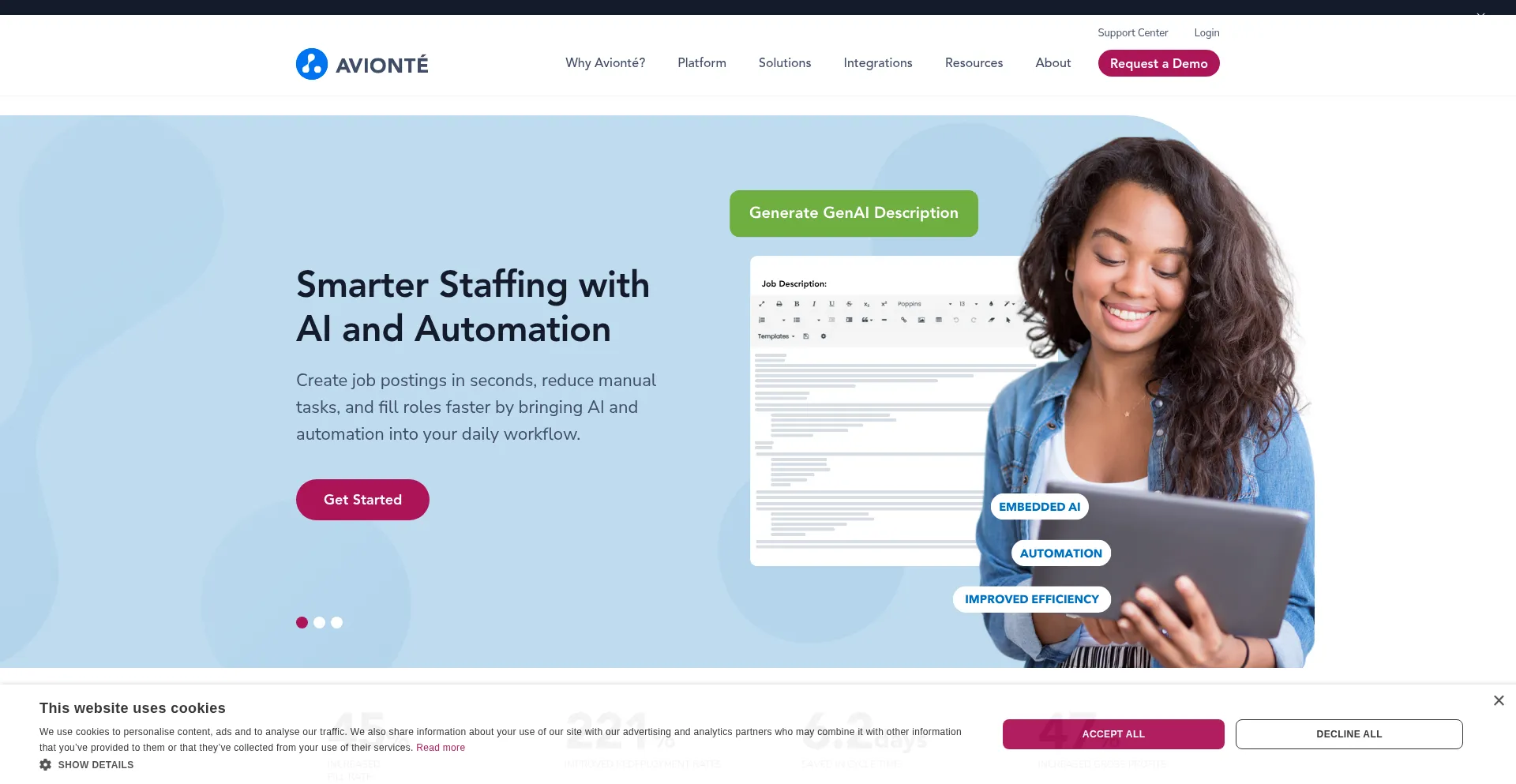 该网站实现符合GDPR或CCPA等隐私法规的cookie同意机制。这表明 avionte.com 遵守数据保护标准并为用户提供对个人数据收集实践的控制。