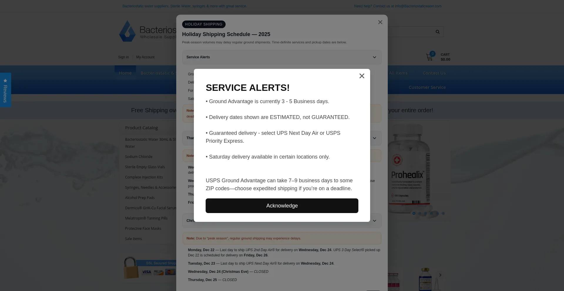 该网站显示来自认可机构的安全认证或信任印章,表明符合安全标准、数据保护协议或行业法规。来自 bacteriostaticwater.com 的信任印章表明遵守已建立的安全实践和运营透明度。