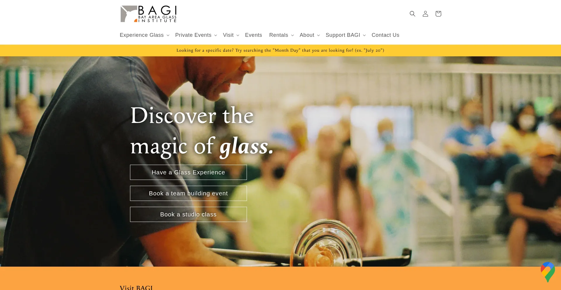 The Bay Area Glass Institute (BAGI) is the premiere public glass arts studio in the South Bay Area. Our 6,000+ sq. ft. facility allows for glassblowing, flameworking, glass fusi...