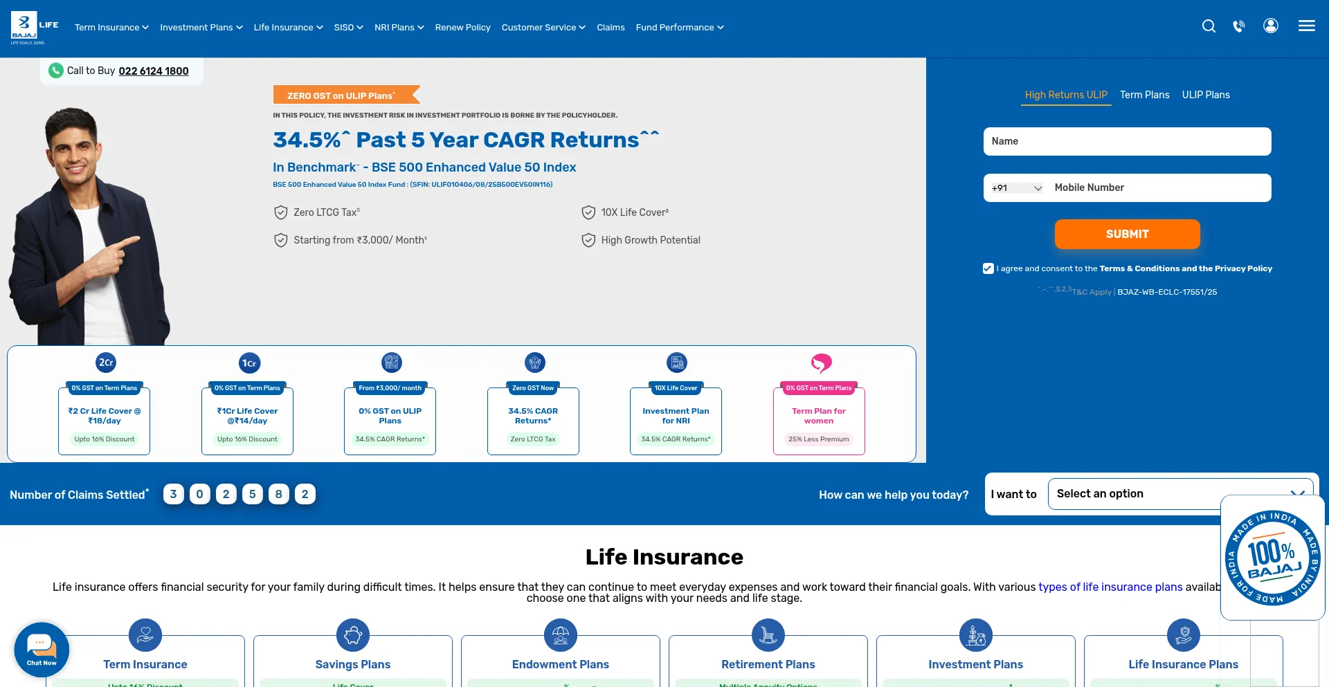 该网站实现数据收集表单,请求个人信息,包括姓名、电子邮件地址、电话号码或其他敏感详细信息。用户应验证 bajajlife.com 的合法性并在提交个人数据前查看隐私政策。
