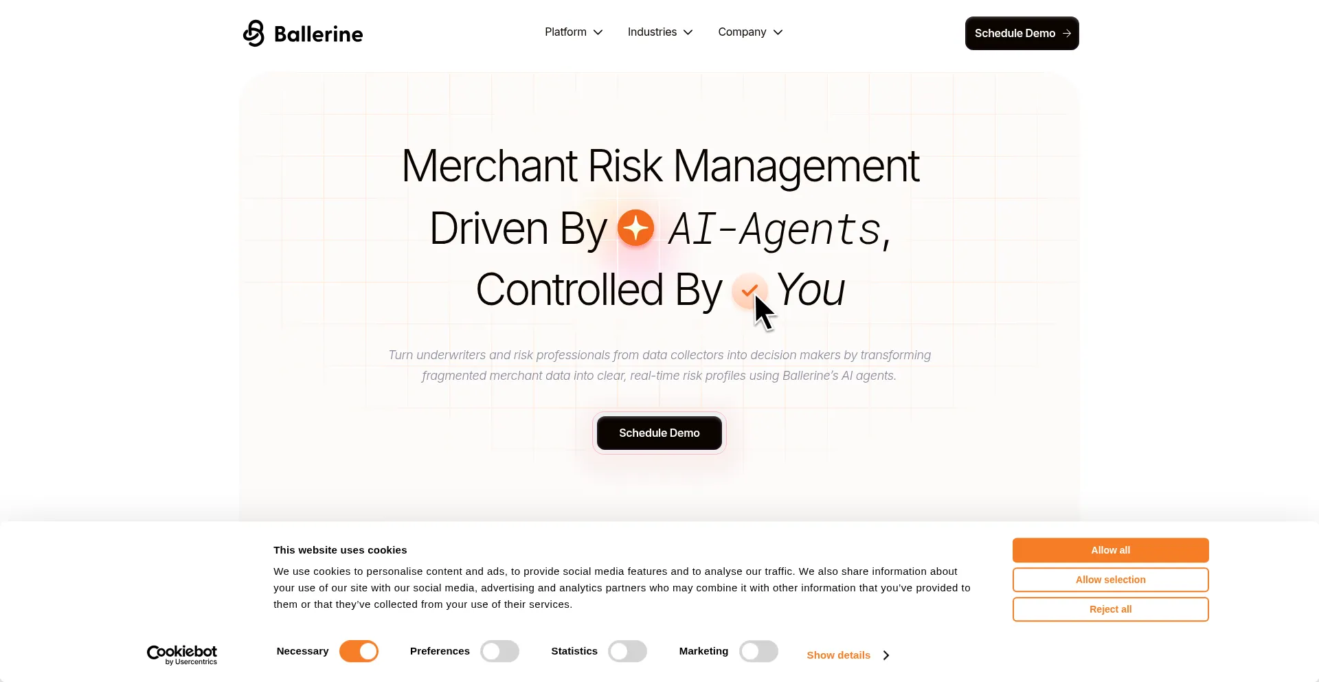 该网站实现符合GDPR或CCPA等隐私法规的cookie同意机制。这表明 ballerine.com 遵守数据保护标准并为用户提供对个人数据收集实践的控制。