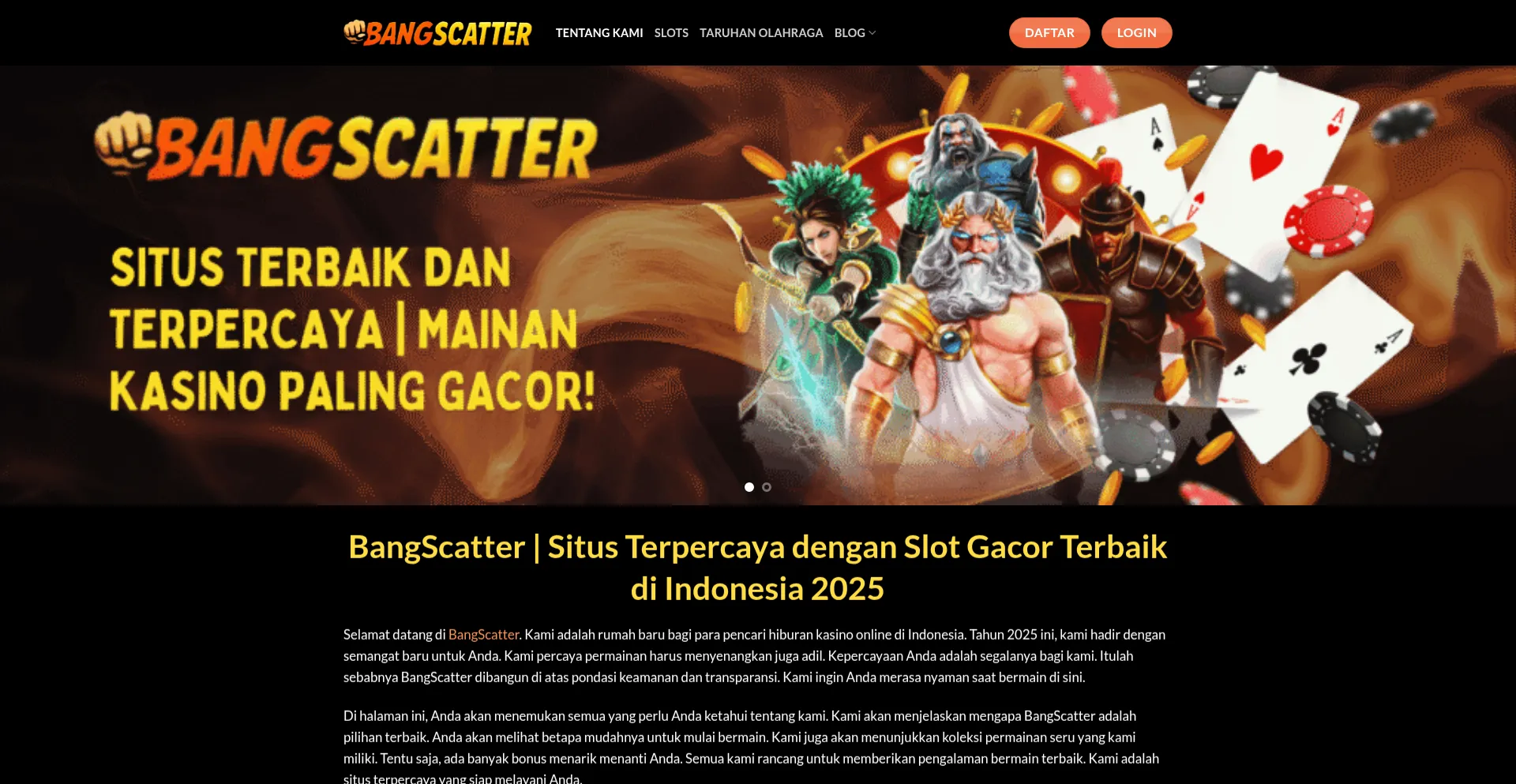 BangScatter adalah indonesia situs judi terpercaya untuk slot mainan kasino paling gacor. Daftar sekarang dan klaim Bonus 200% + 88 Spin Gratis untuk mulai menang besar!