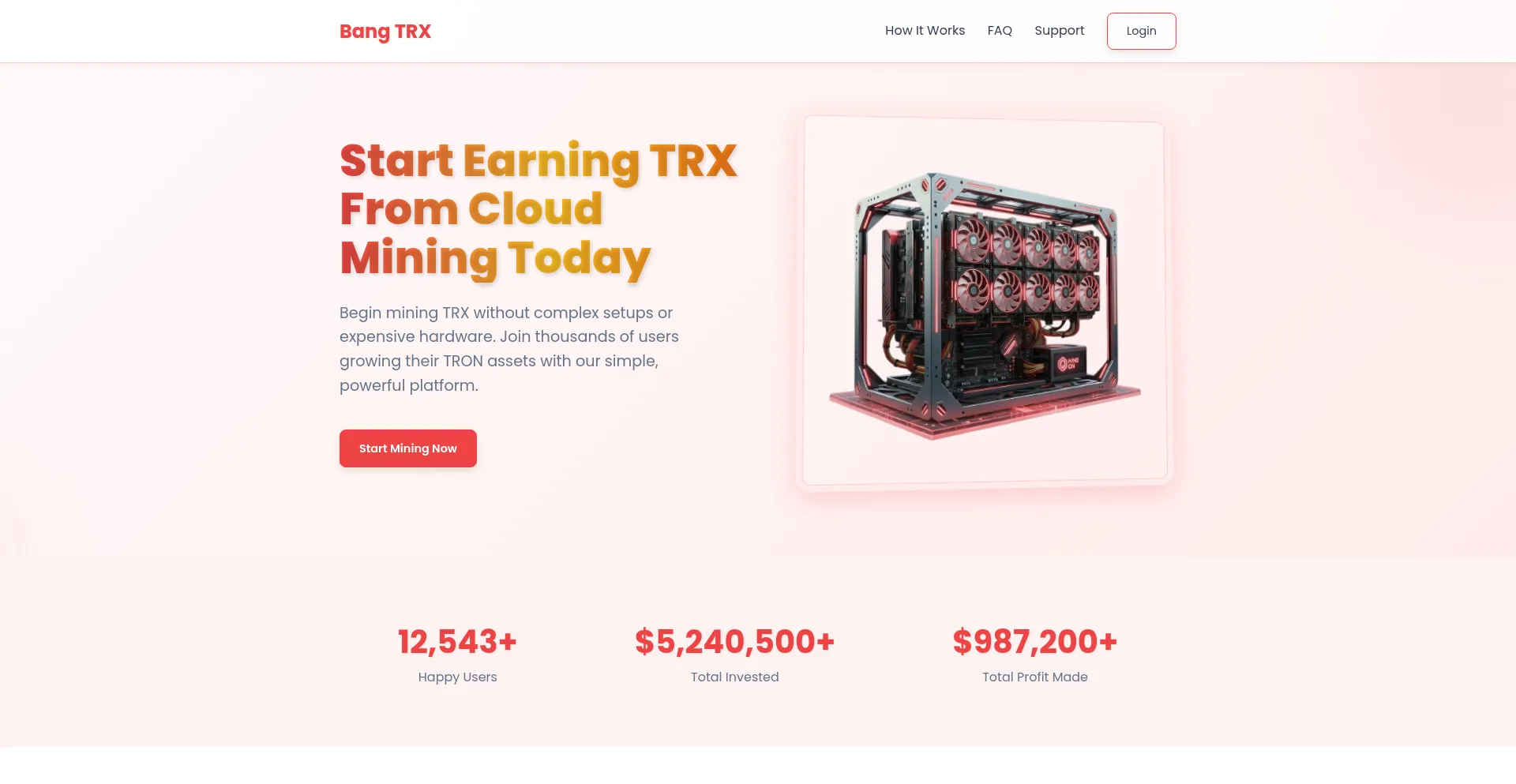 网站 bangtrx.com 可能提供云挖矿服务或加密货币挖矿投资。一些平台提供合法的挖矿租赁服务,而其他平台可能使用虚假的挖矿仪表板来显示无法提取的虚拟收益。