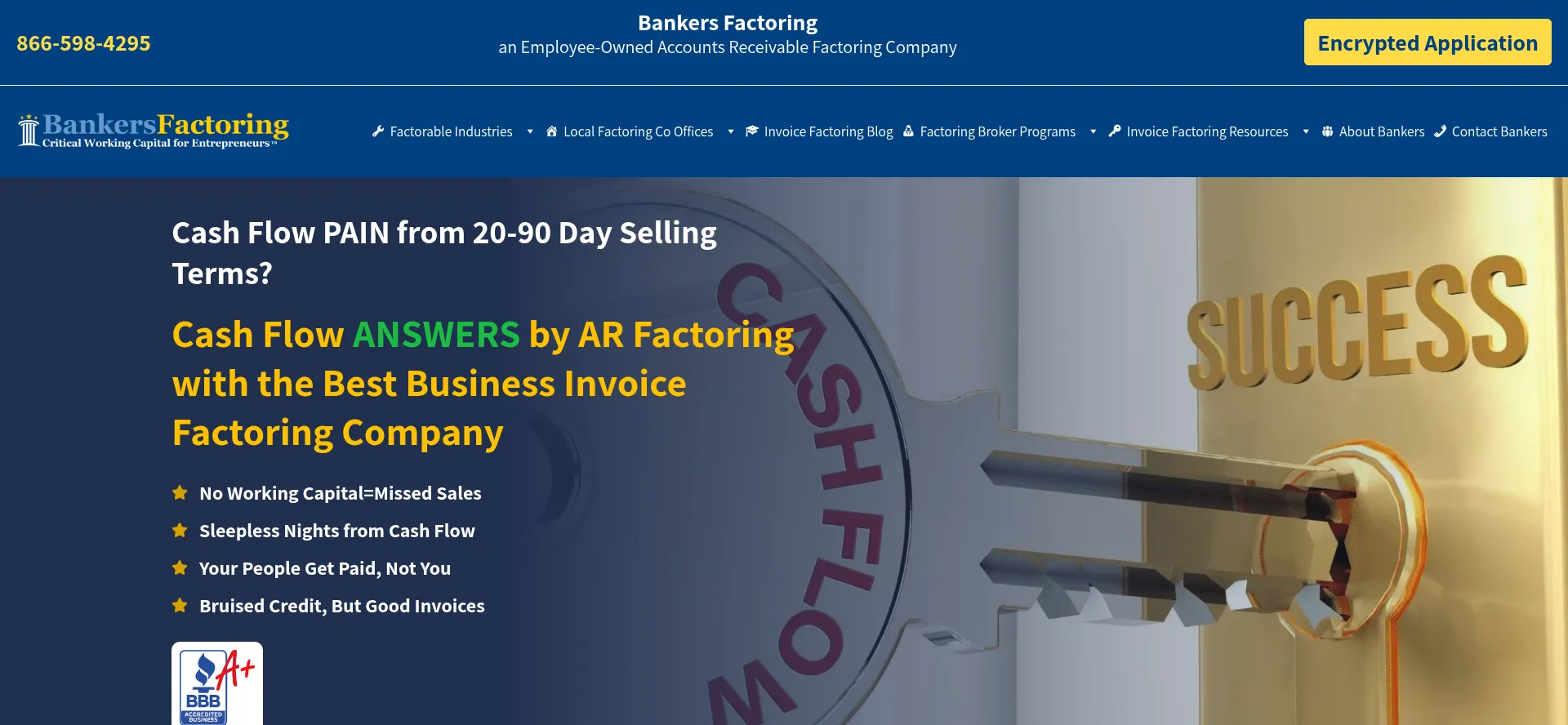该网站显示来自认可机构的安全认证或信任印章,表明符合安全标准、数据保护协议或行业法规。来自 bankersfactoring.com 的信任印章表明遵守已建立的安全实践和运营透明度。