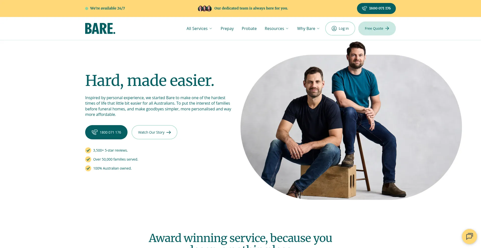 Bare provides quality cremation, funeral and memorial services and a dedicated care team that helps you each step of the way. Arrange online or via phone. Call us on 1800 071 176