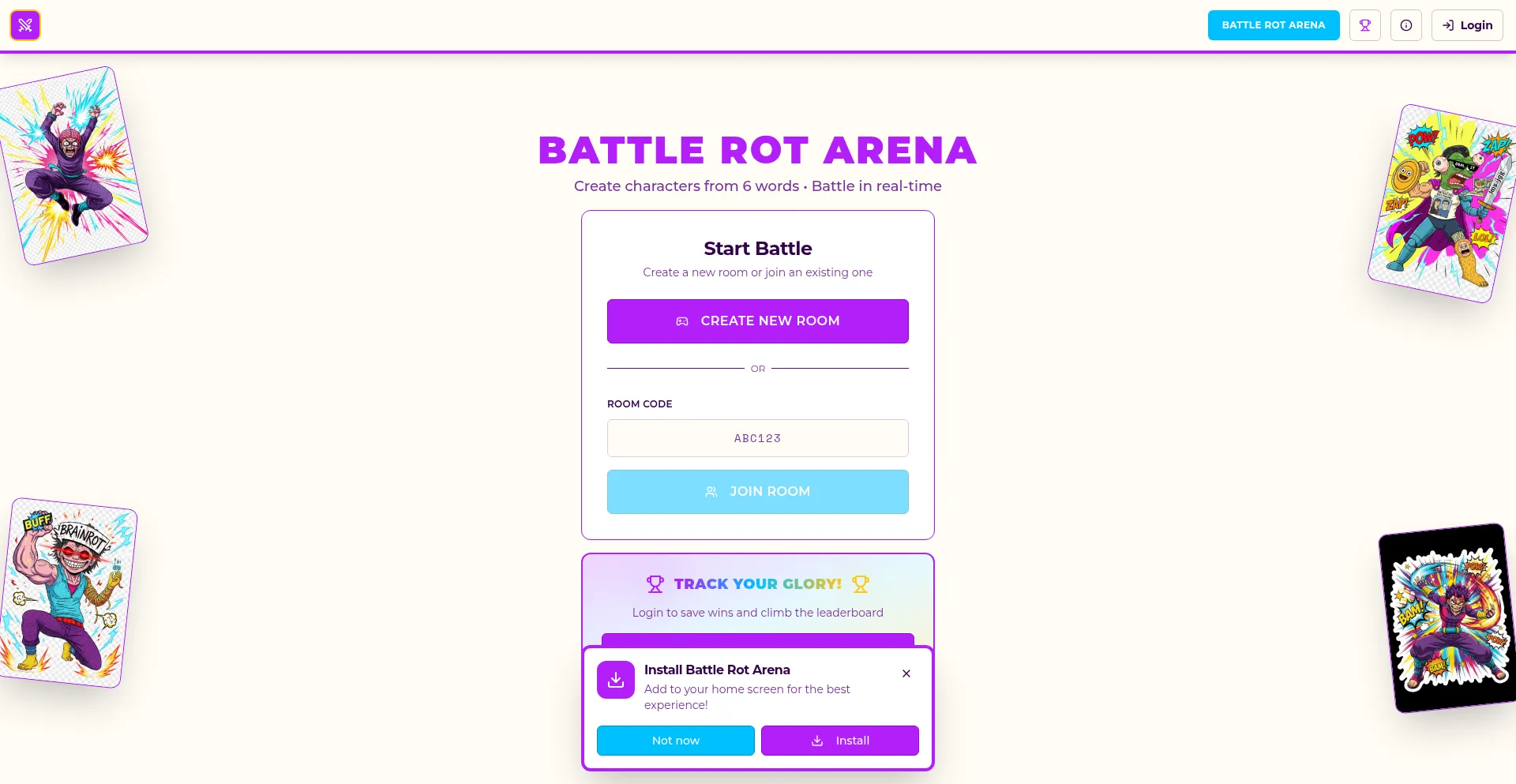网站 battlerot.com 被配置为一个带有移动应用功能的网络应用。用户可以直接将该网站安装到设备的桌面上,以快速访问并享受类似移动应用的体验。