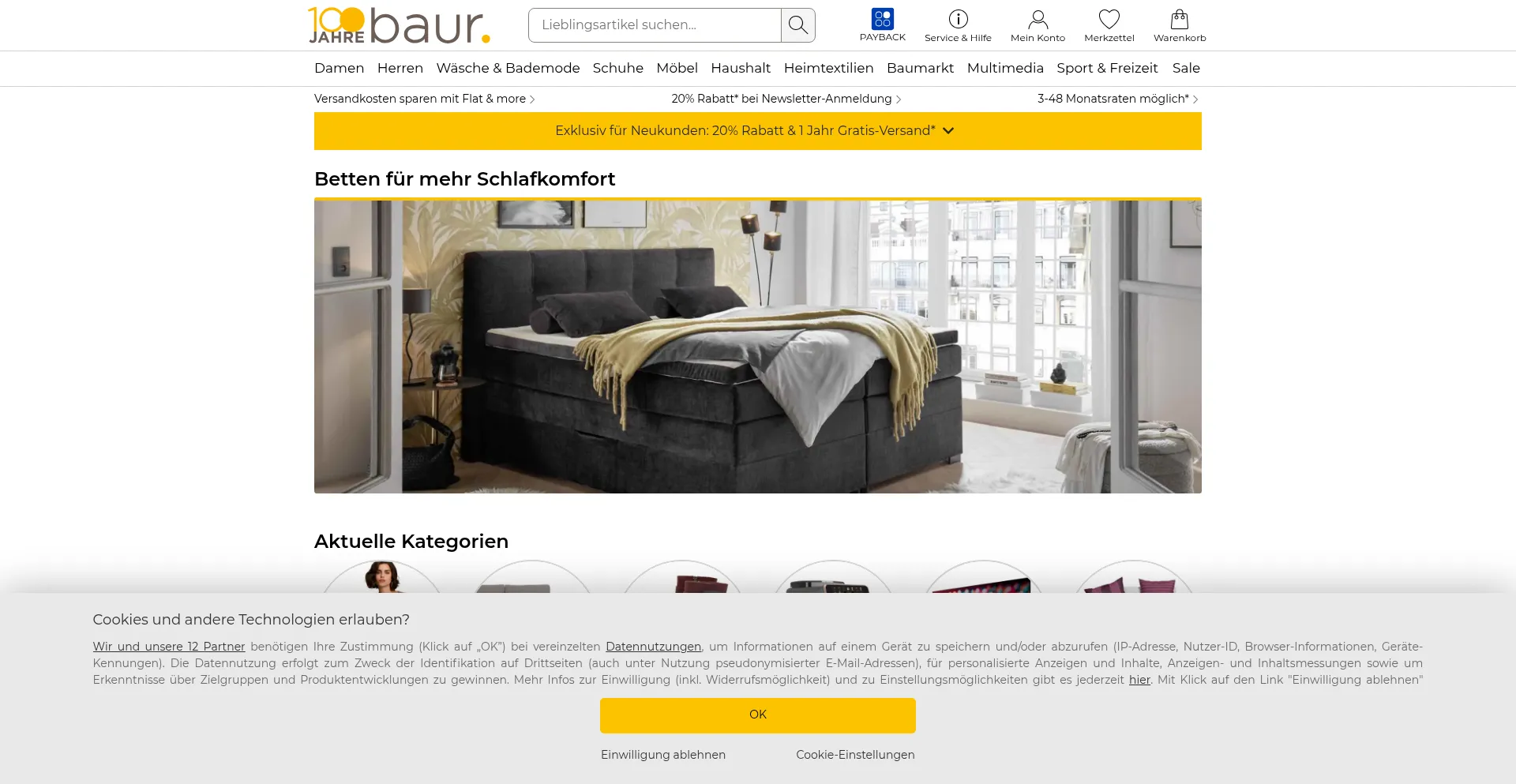 该网站实现符合GDPR或CCPA等隐私法规的cookie同意机制。这表明 baur.de 遵守数据保护标准并为用户提供对个人数据收集实践的控制。