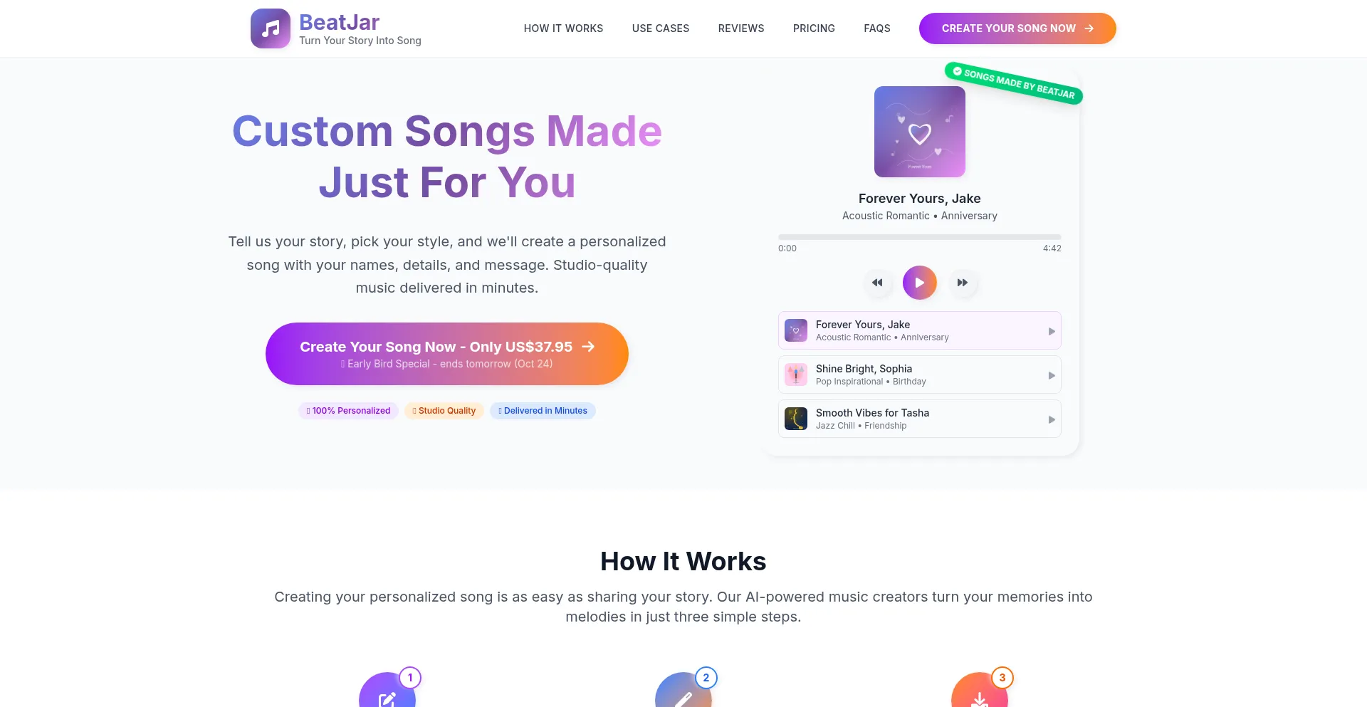 Turn your life moments into custom-made songs. Professional music creation service with lightning-fast delivery. Perfect personalized gifts for any occasion.