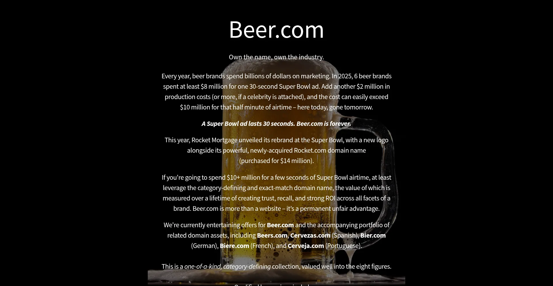 The one and only Beer.com global domain name portfolio is now available for the right buyer!! Contact us for more information.