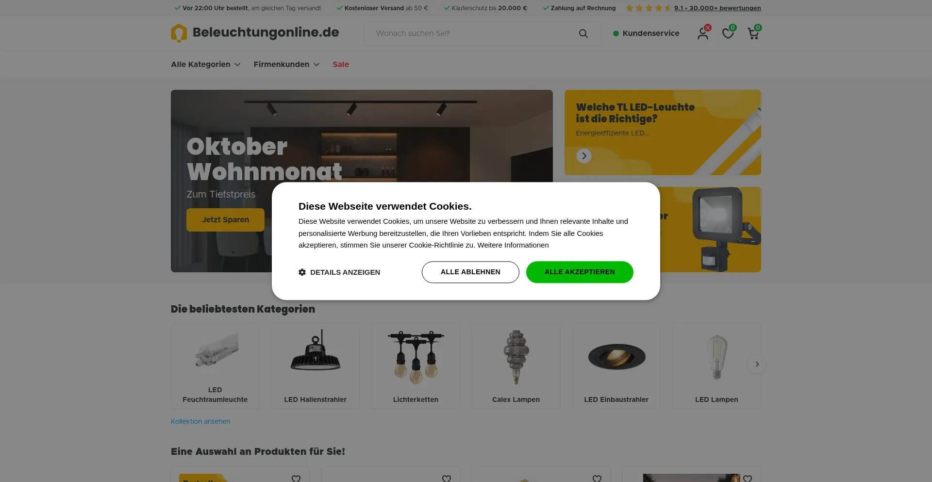 该网站实现符合GDPR或CCPA等隐私法规的cookie同意机制。这表明 beleuchtungonline.de 遵守数据保护标准并为用户提供对个人数据收集实践的控制。
