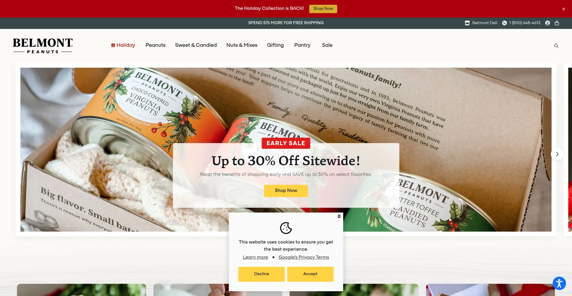 该网站实现符合GDPR或CCPA等隐私法规的cookie同意机制。这表明 belmontpeanuts.com 遵守数据保护标准并为用户提供对个人数据收集实践的控制。