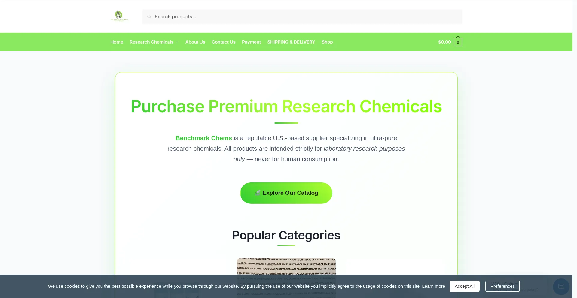 分析表明 benchmarkchems.com 作为电子商务平台运营,促进商品或服务的在线交易。该网站实现了购物车功能、支付处理系统和产品目录功能,这些是商业零售运营的典型特征。