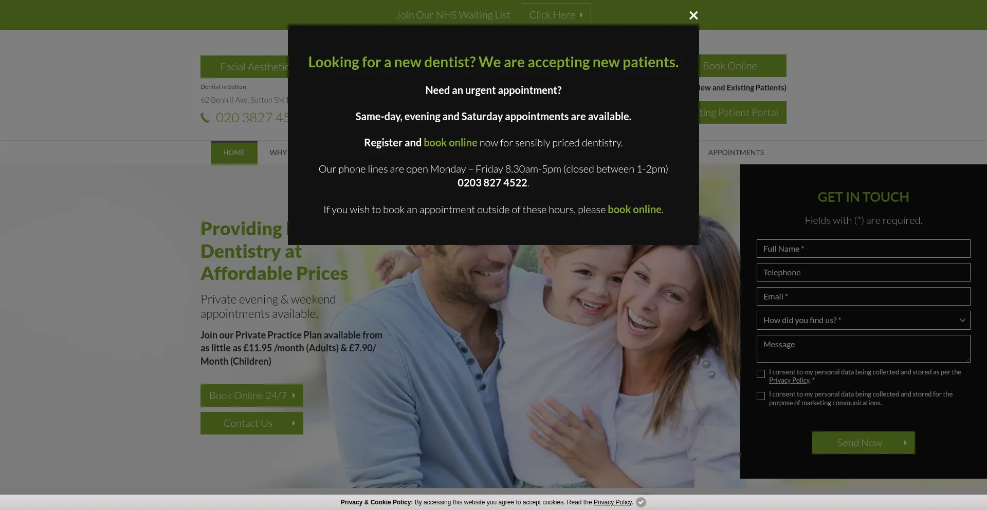 该网站实现数据收集表单,请求个人信息,包括姓名、电子邮件地址、电话号码或其他敏感详细信息。用户应验证 benhill-dental-practice.co.uk 的合法性并在提交个人数据前查看隐私政策。