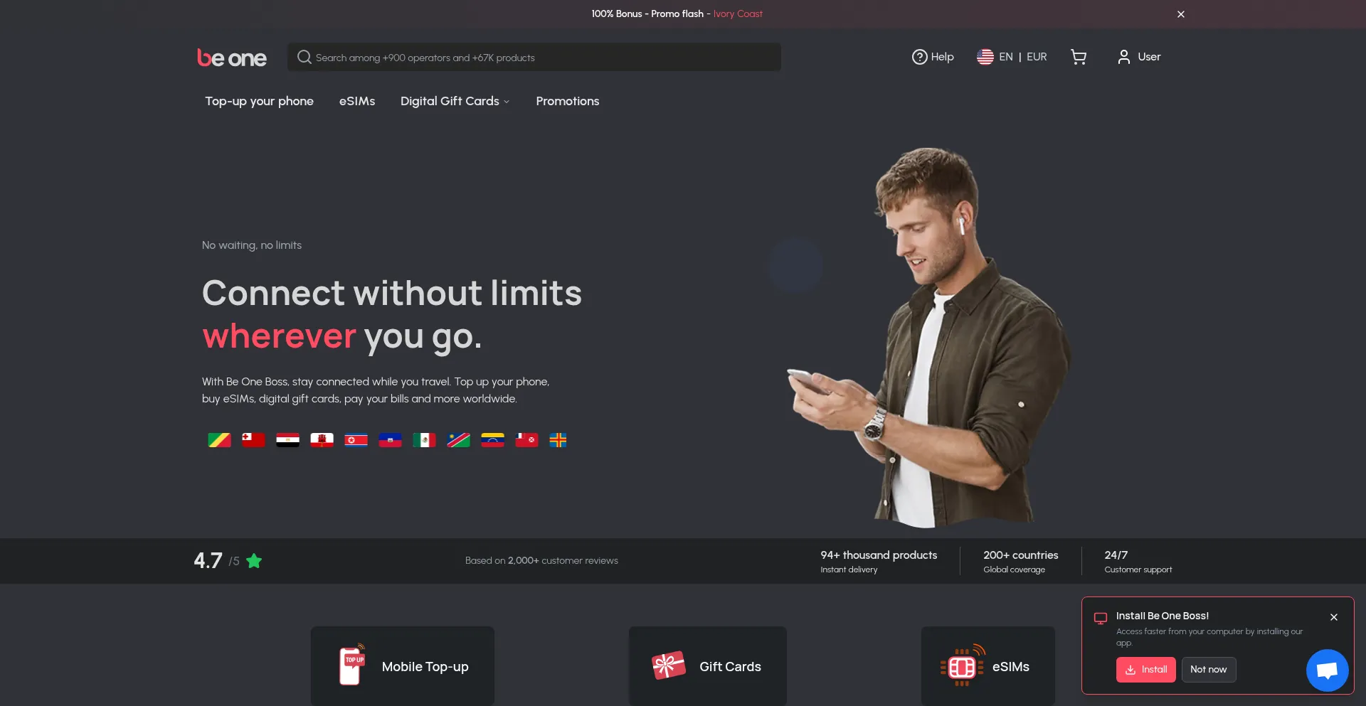 With BeOneBoss you can top up mobiles in more than 200 countries, buy eSIMs to travel without roaming, and instantly purchase digital gift cards. All in one place.