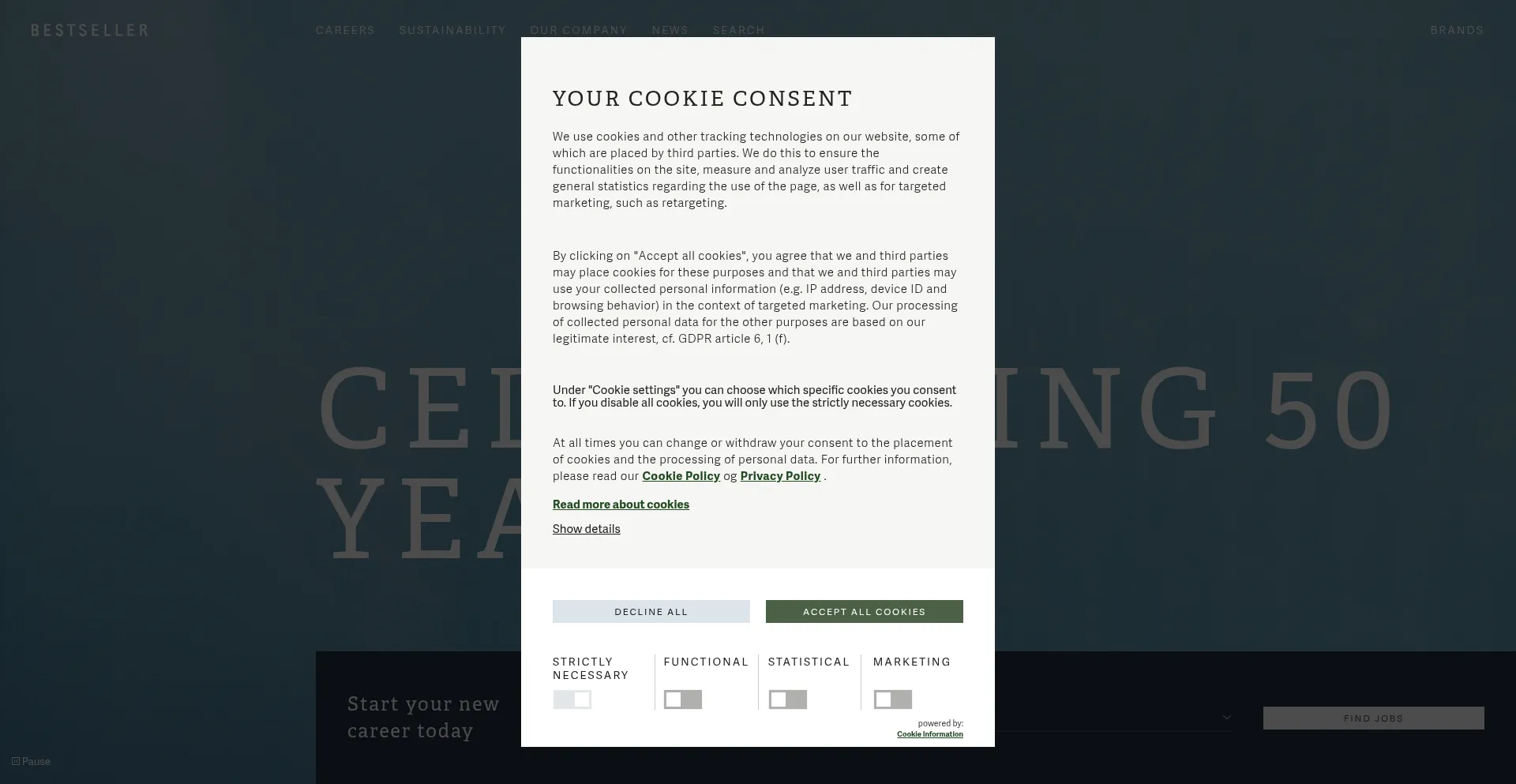 该网站实现符合GDPR或CCPA等隐私法规的cookie同意机制。这表明 bestseller.com 遵守数据保护标准并为用户提供对个人数据收集实践的控制。