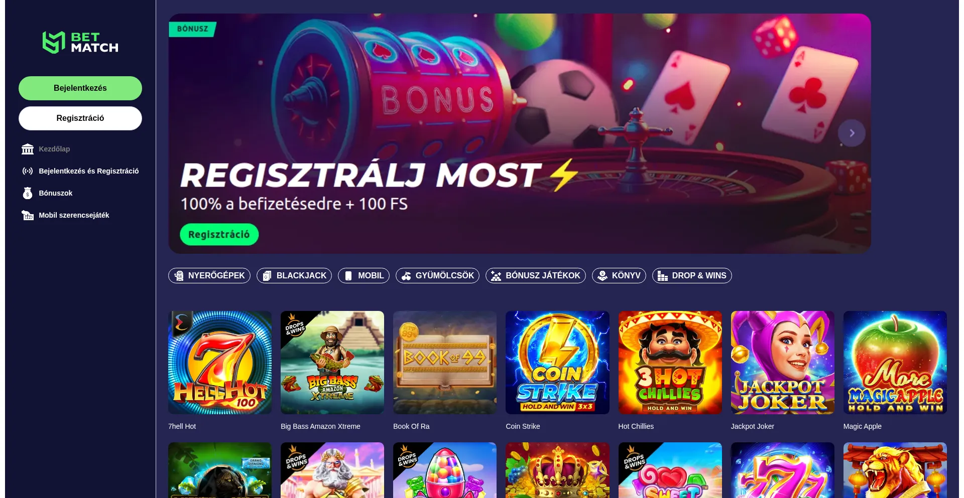Csatlakozzon a Betmatch-hez a páratlan szerencsejátékért Magyarországon! Játsszon elsőrangú nyerőgépekkel, nyerjen sportfogadásokat, és merüljön el az élő osztó...