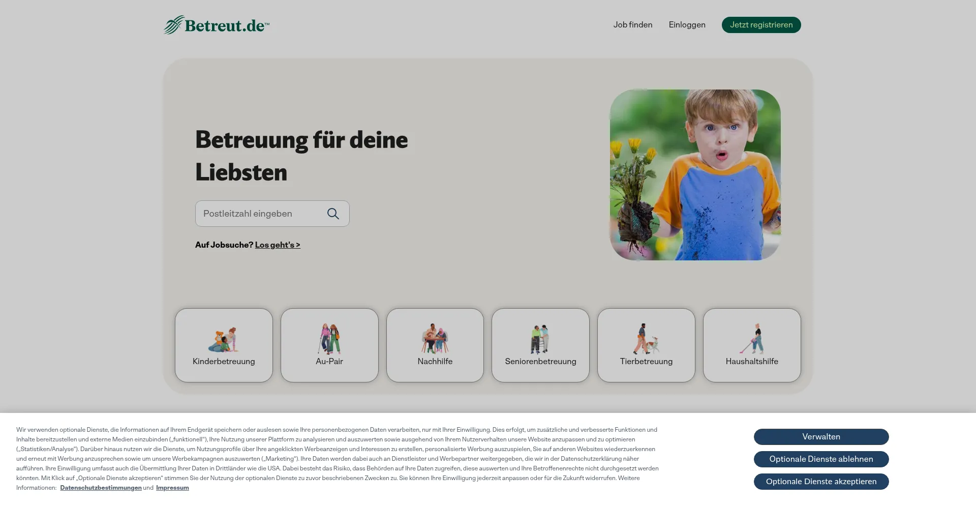 该网站实现符合GDPR或CCPA等隐私法规的cookie同意机制。这表明 betreut.de 遵守数据保护标准并为用户提供对个人数据收集实践的控制。