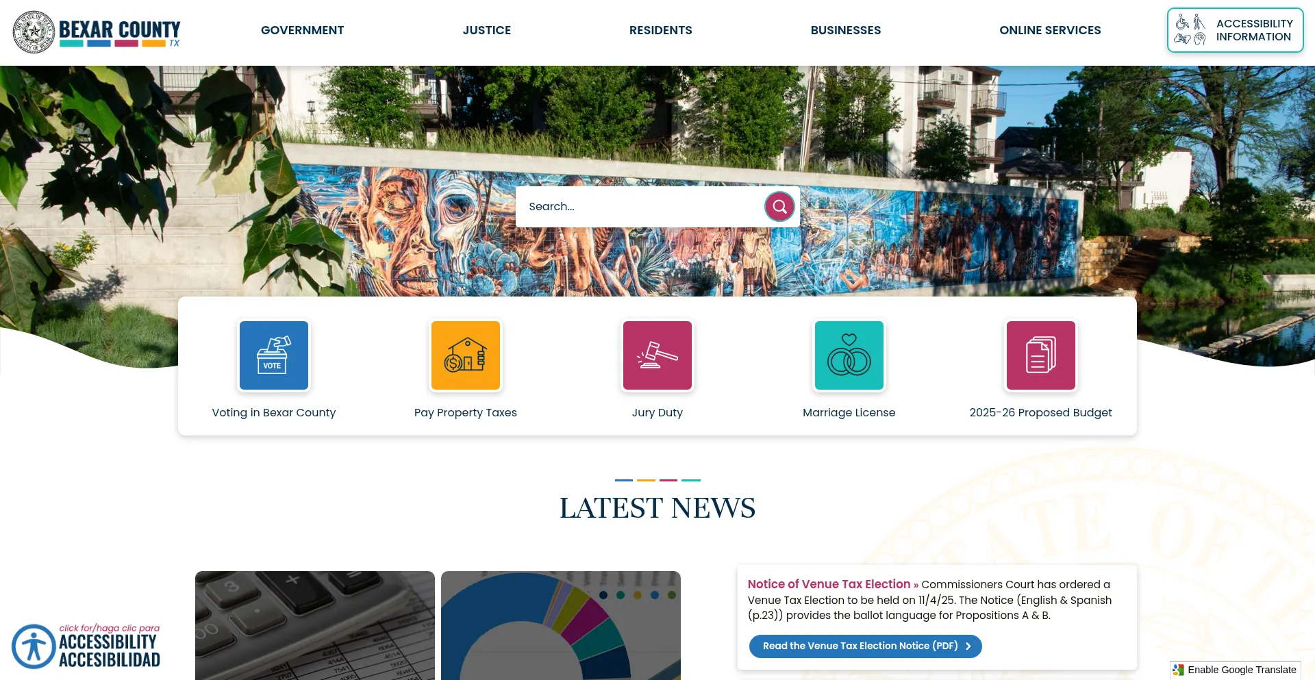 Bexar County Government website. Commissioners Court, Elected Officials, County Offices, Jury Duty Information, Election Information, Court Information, Community Information an...