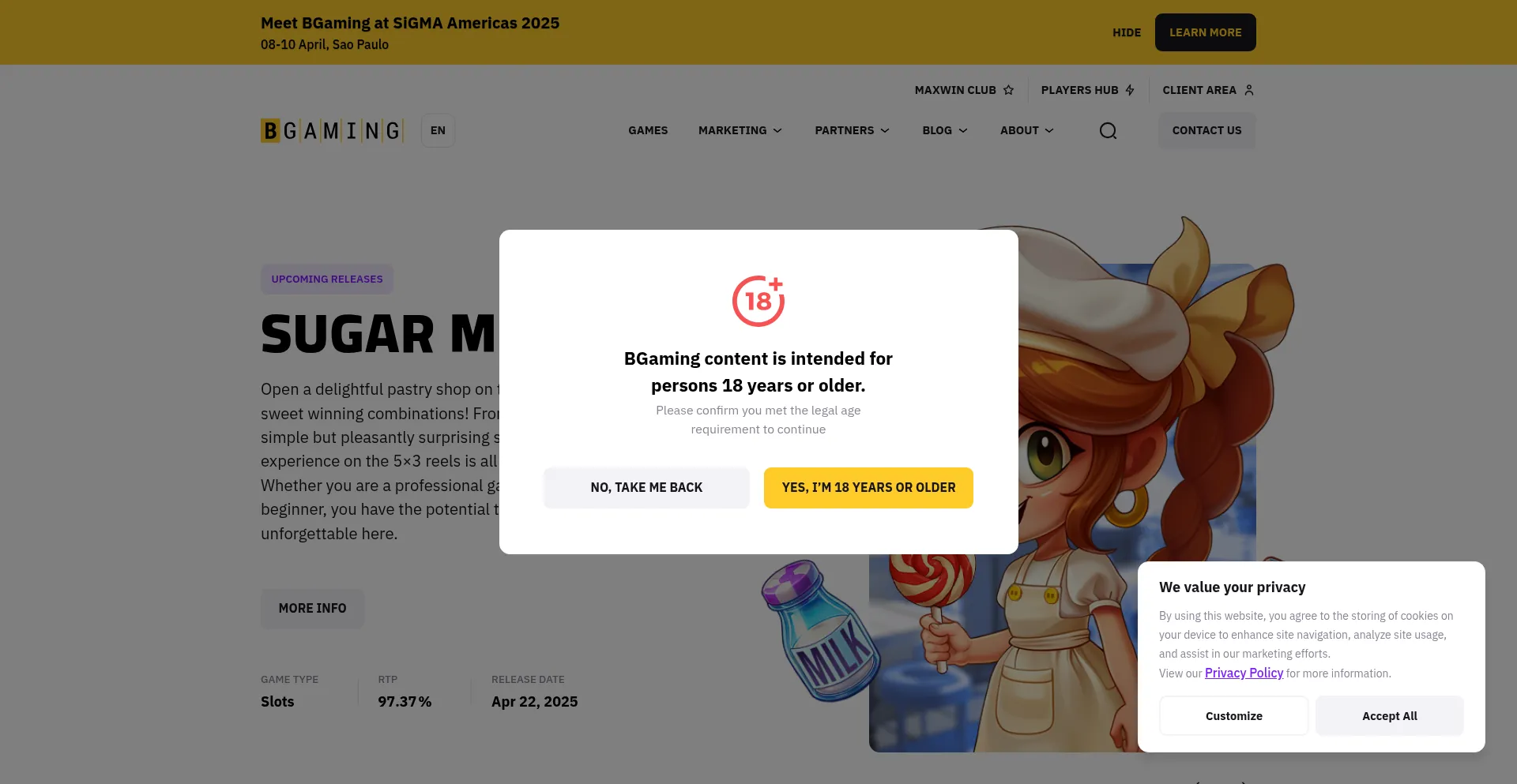 该网站实现符合GDPR或CCPA等隐私法规的cookie同意机制。这表明 bgaming.com 遵守数据保护标准并为用户提供对个人数据收集实践的控制。